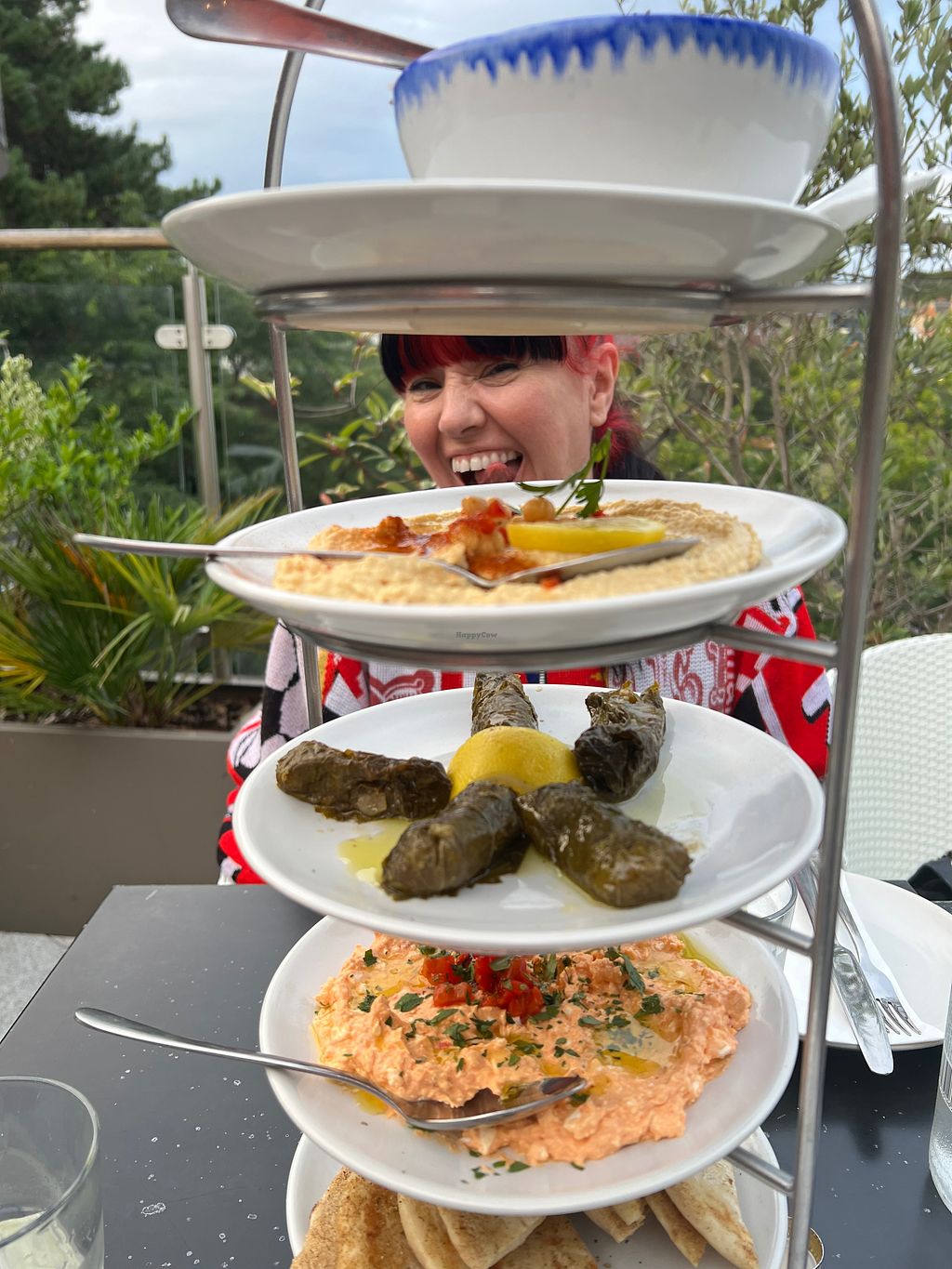 Vegan goodies, (stuffed vine leaves, hummus, flat bread,) and one vegg…