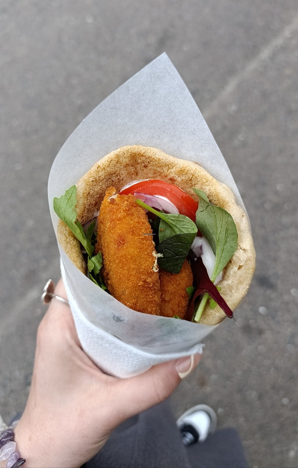 In the vegan gyros they put these deep fried vegetable patties and it tastes good, the portion is perfect, very filling. However it does not have that classic greek flavor, something is missing.