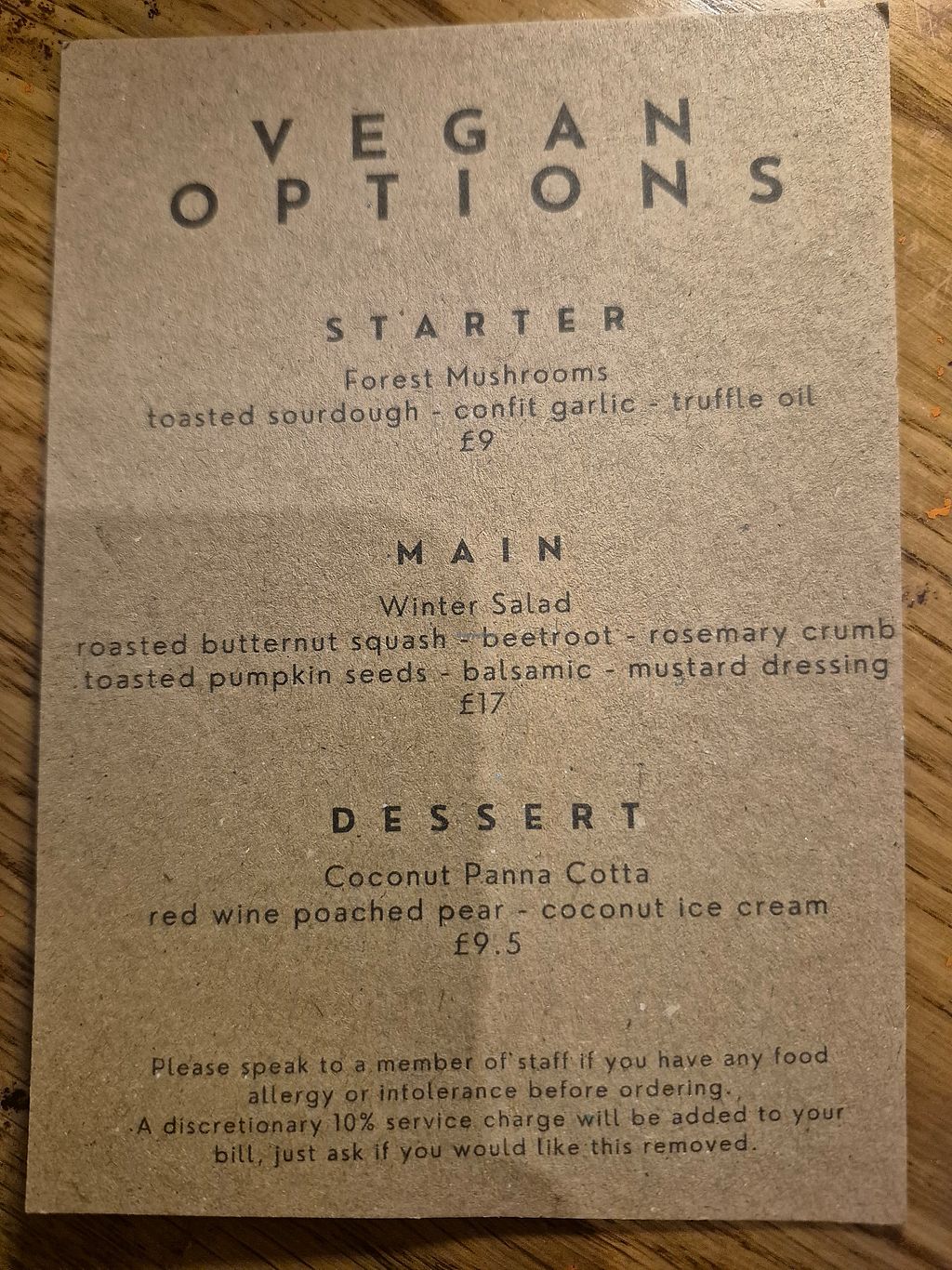 This pub is a busy place, has great views of the sea. There is 1 vegan option, a winter salad as a main. We asked if anything else could be 'veganised'. After speaking to the chef it was felt a reluctance to modify anything as we were told ' chef would have to heavily amend a mushroom burger' which we found astonishing. Anyway, when it came it was tasty and plentiful. I only give this place 2 stars as the waiter then went on to say how they dont get asked for vegan anymore, unlike 2 years ago lots of people were asking...i feel our prescence as a vegan was just not welcome. There are better eateries in Cromer for vegans.