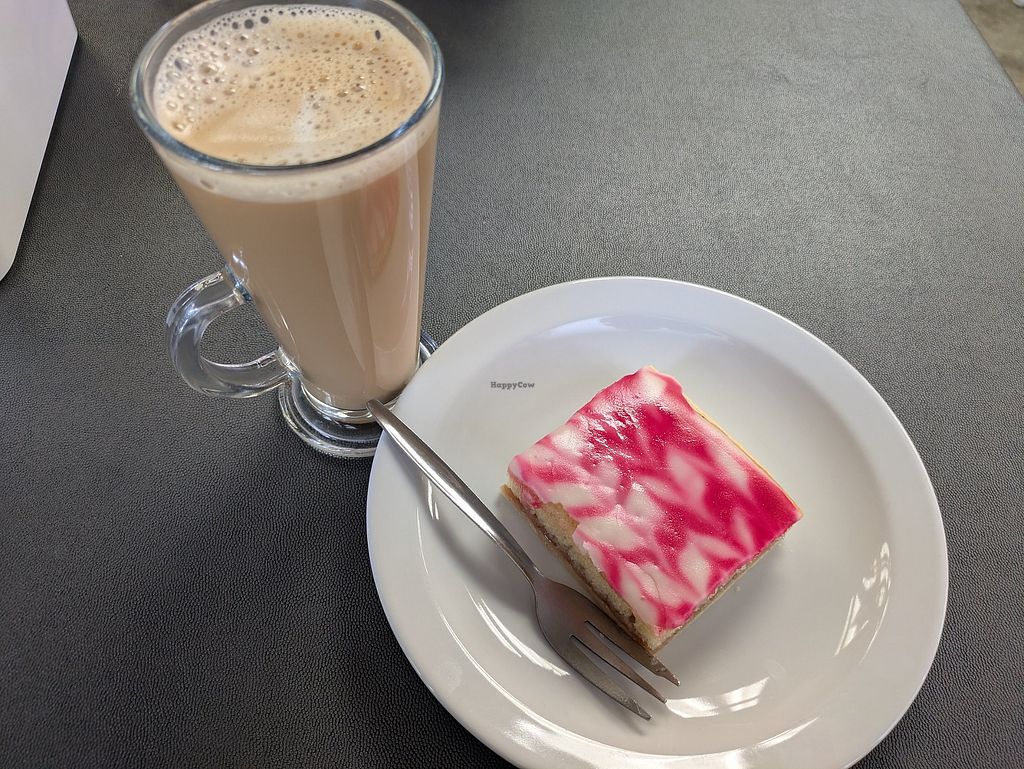 Bakewell tart and oat latte
