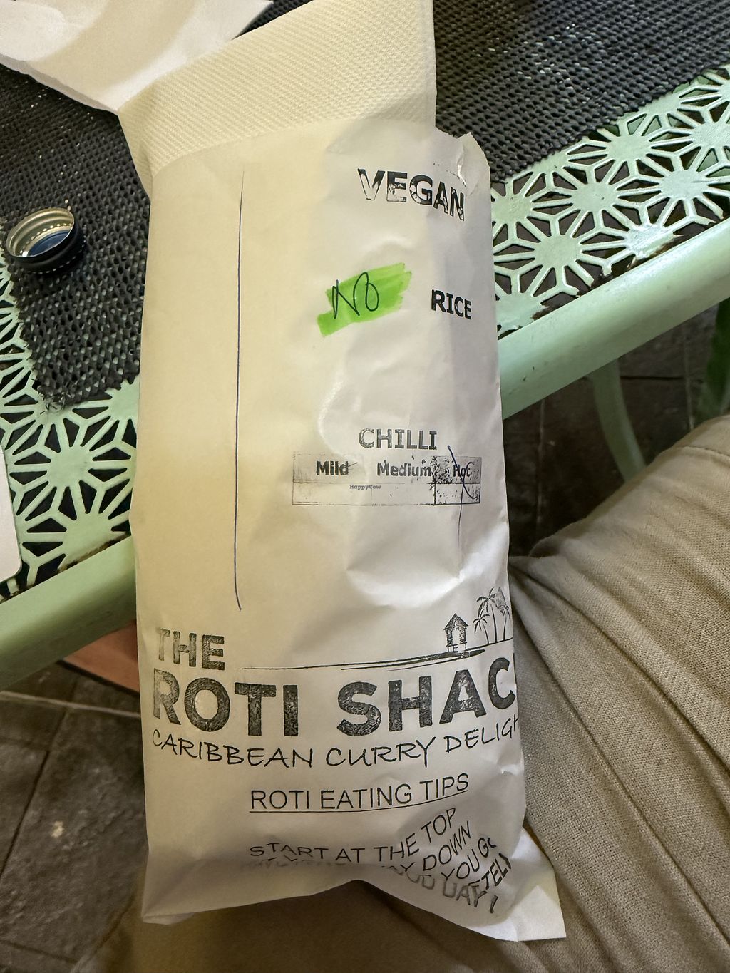 Would recommend roti shack for a quick eat that's going to fill you up and be tasty. The vegan option comes with all the fillings (all vegan) wrapped in a roti (burrito style). Quite cheap and there are seats outside and inside. I did ask for medium spice but couldn't taste anything so if you like spicy maybe ask for hot.