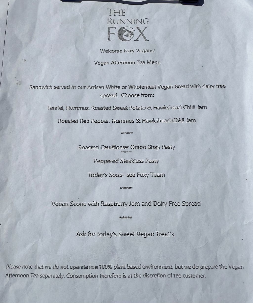 Had the most incredible and filling afternoon tea. Sandwich was absolutely massive, as was the steakless pasty, scone and biscoff cake. And so so tasty. £25.50 was expensive but not unreasonable in today's money! Would deffo recommend. And gluten free options too, although limited gluten free vegan.