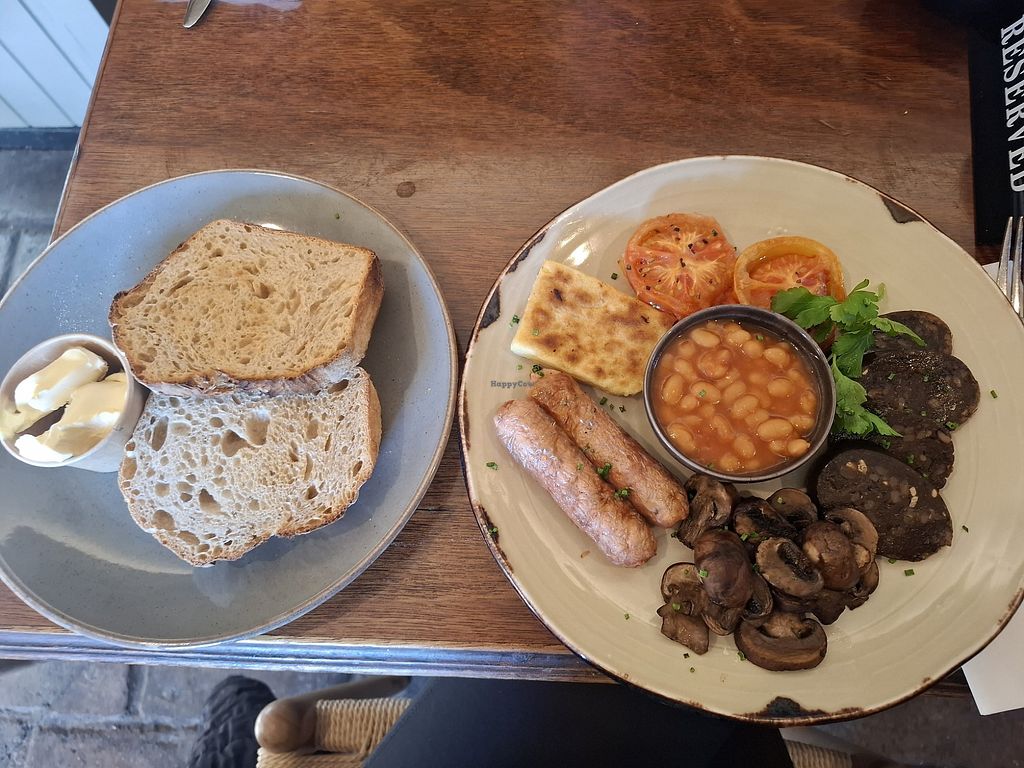 Vegan breakfast at The Running Fox. Includes vegan sausages and black …
