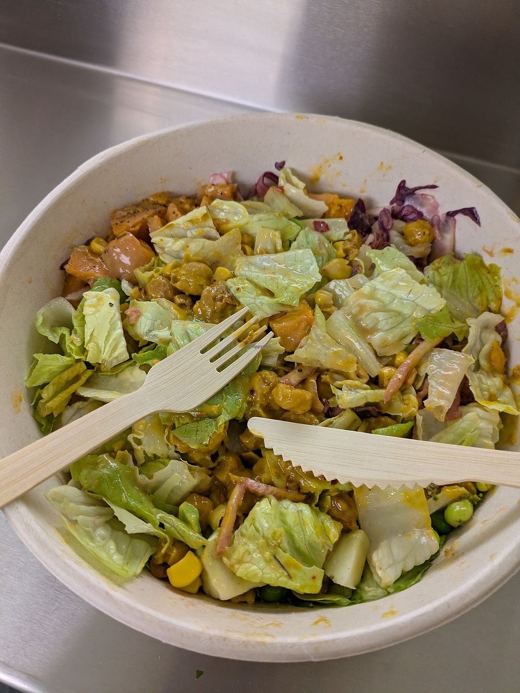 Serves meat, vegan options available. Modern salad bar with customizable, made-to-order salad and grain bowls. Vegan add-ins and toppings include roasted sweet potato, tomato, cucumber, corn, roasted broccoli, onion, maple walnuts, avocado, tofu and more. Open Mon-Sun 11:00-21:00.