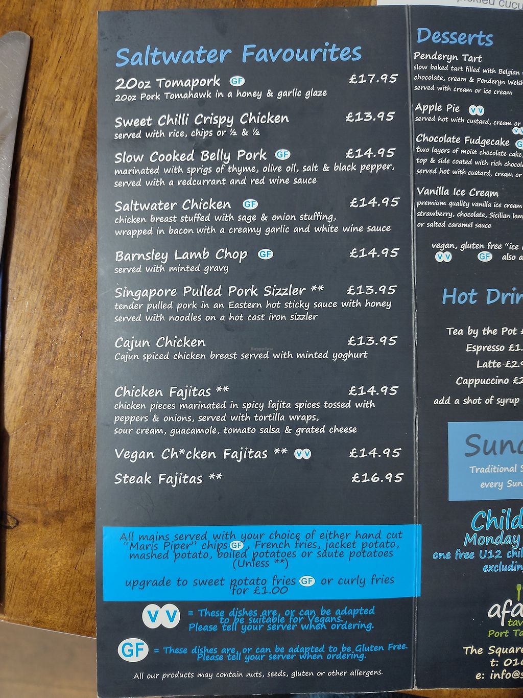 The best selection of vegan options I’ve come across anywhere in Porthcawl. Jackfruit bites as a starter, Thai vegan burger, Vegan shepherds pie, Banana blossom fish and chips (the best I’ve had anywhere), a jackfruit Balti, possibly another option I’ve forgotten, and a few vegan desserts that I was too full to try.