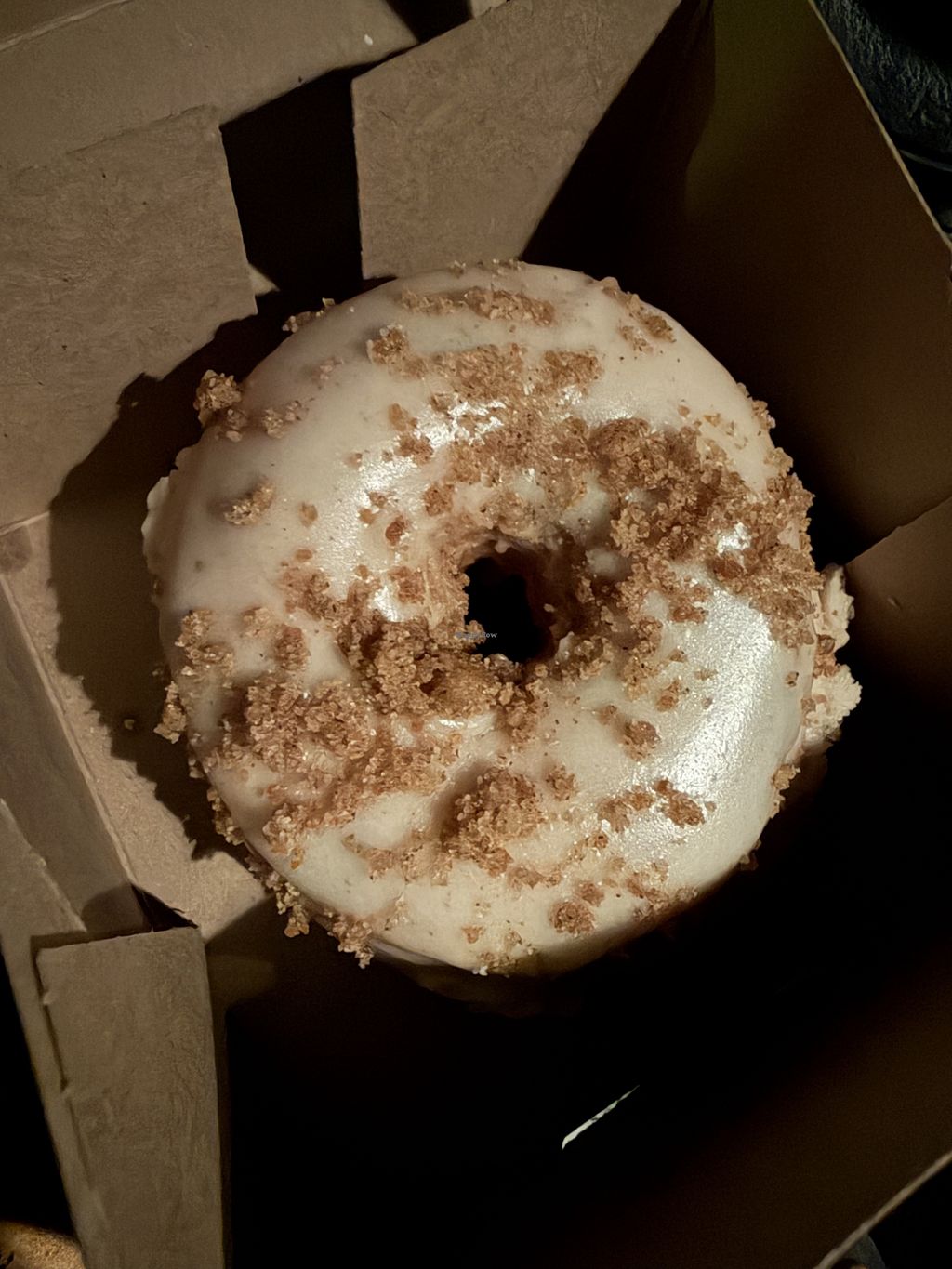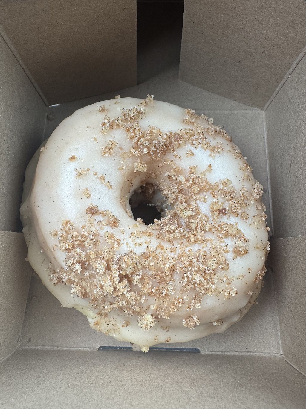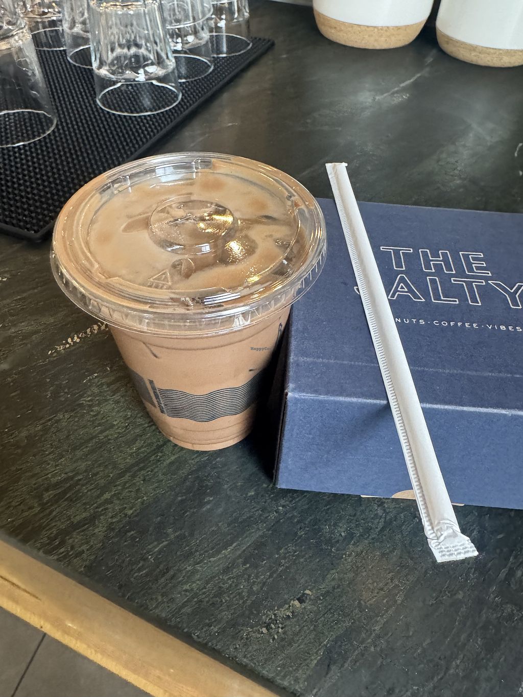 Vegan cinnamon sugar donut, iced decaf latte with oat milk (extra char…