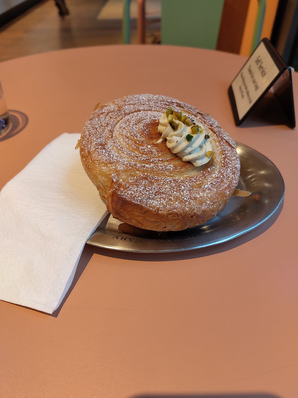 As pretty as it looked it was just really disappointing. Huge pastry, very little cream which didn't taste like pistachio at all. Not the right color either. Maybe it's diluted? I don't know. The pastry felt like a sugary dry dough with some little liquid fat inside. That's it. That's not enough for me. Definitely not for the pretty high price.