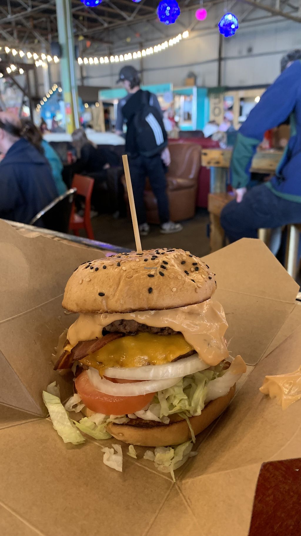 Had the vegan Buffalo chicken burger and it was just perfect. They have several burger and wraps options to choose from. Place is located inside a warehouse with other vendors. Cool industrial vibe!