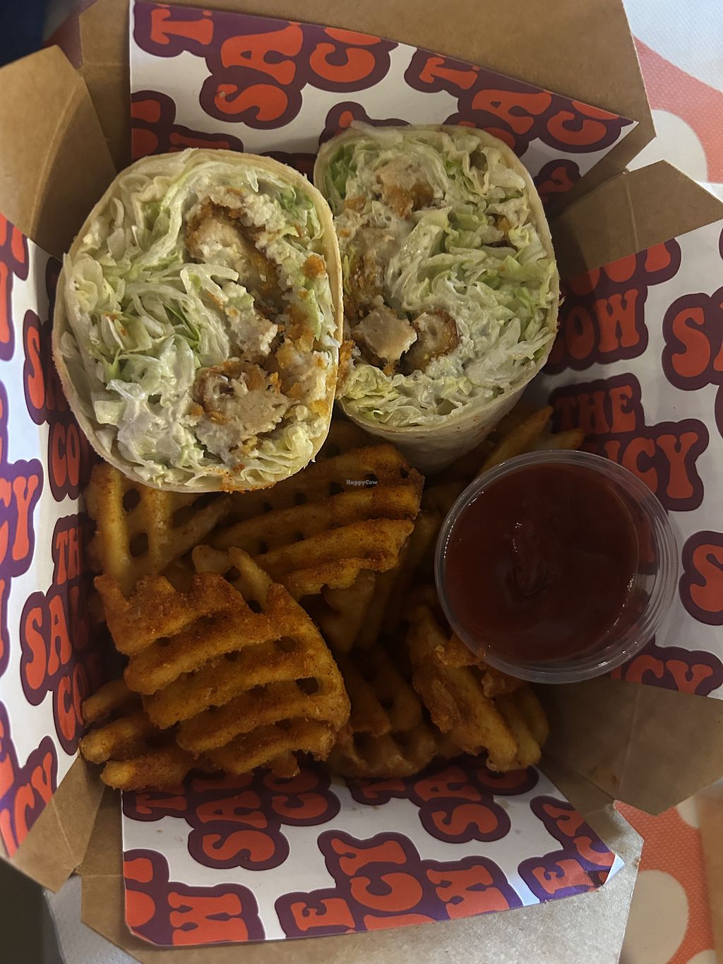 Caesar wrap with lattice fries and ketchup.