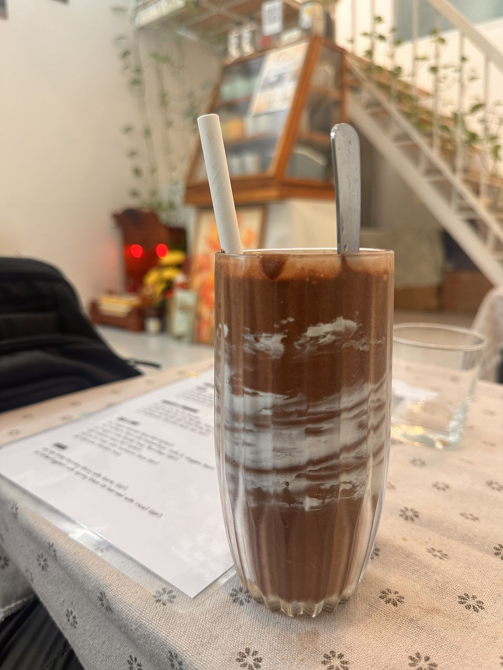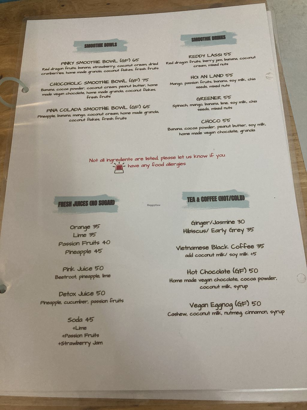 Fantastic menu and very sweet, gentle staff. The deserts are what set this place apart! Never see vegan deserts, ever! I ate a delicious “snickers” and I had more time in Hoi An would come back here daily for a different sweet treat! I sat down on a floor seat and table as soon I entered which wasn’t ideal air con wise but I think it was the ground floor and that perhaps there was an upper floor which some people exited from. Will definitely be coming back next time!!!