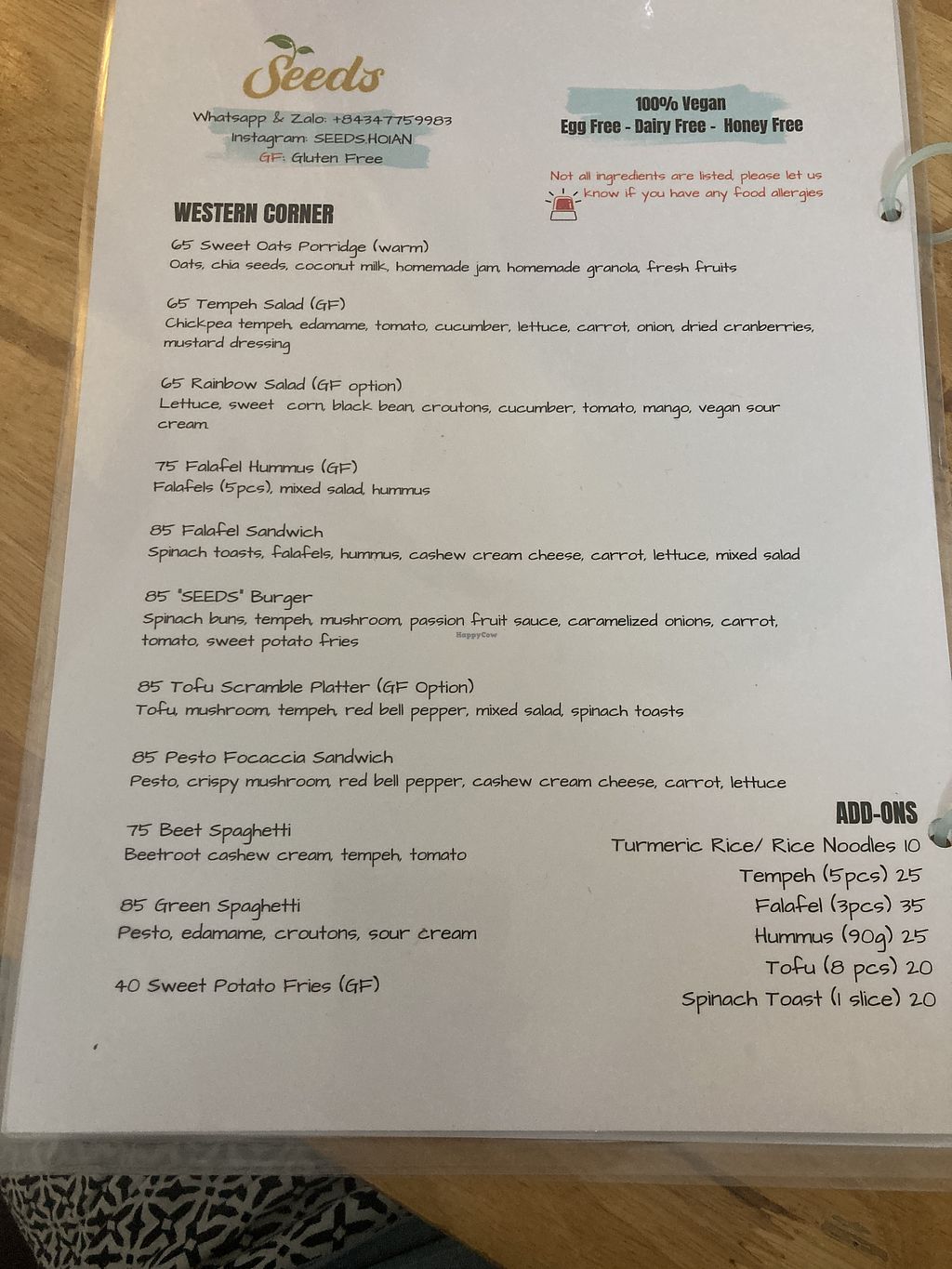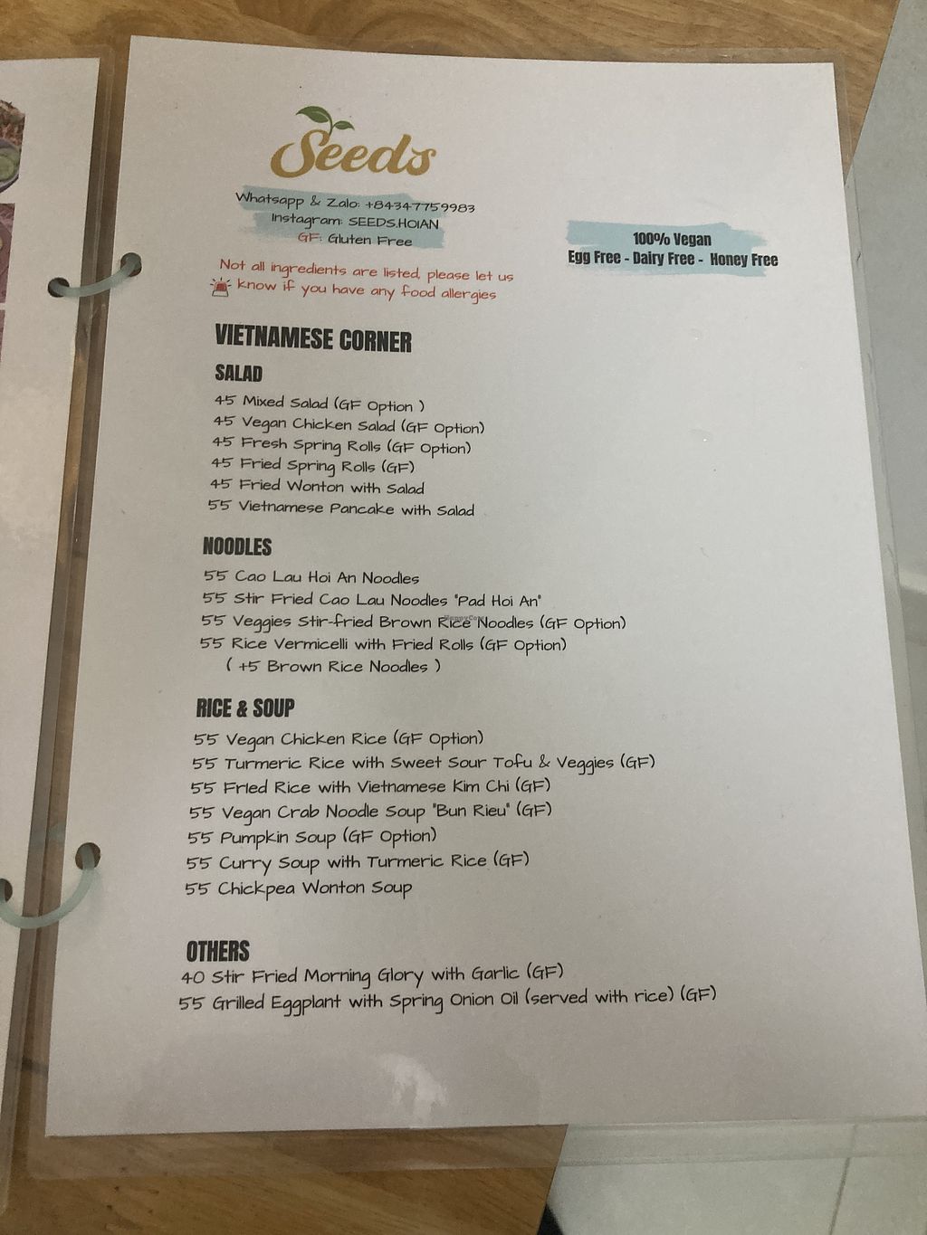 I stayed in Hoi an for one month and was so glad when I found Seeds. It has a wonderful menu with a mix of Vietnamese local foods and interesting western dishes, all fresh and handmade. Not much oil, good size portions, great flavours 😊🤩