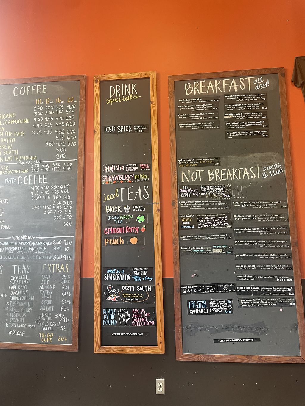 We have been visiting this coffee shop for coffee, pastries, and breakfast for years. The menu has several clearly labeled options for breakfast (all day) & lunch, including limited time specials. It’s always yummy, and the service is always good.