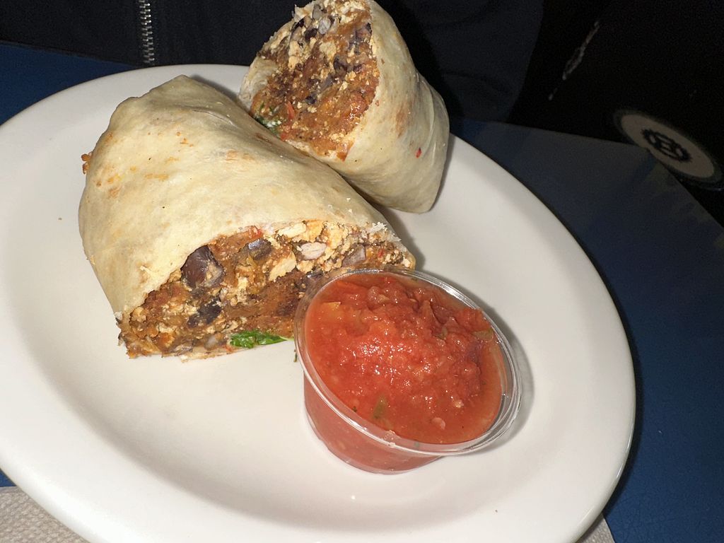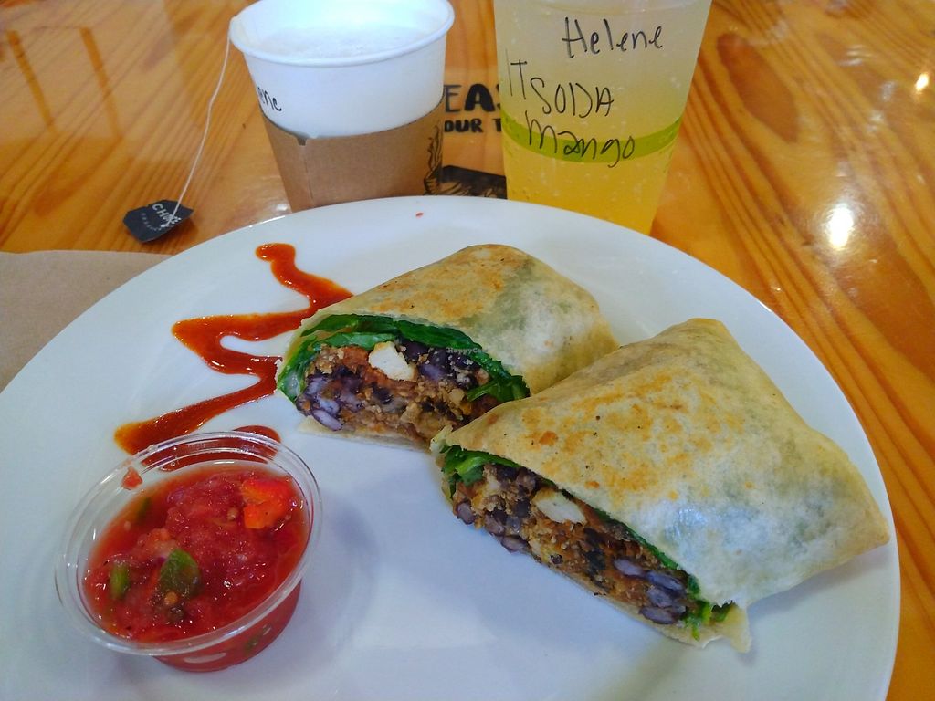 Vegan breakfast burrito, mango Italian soda, and earl grey tea latte w…