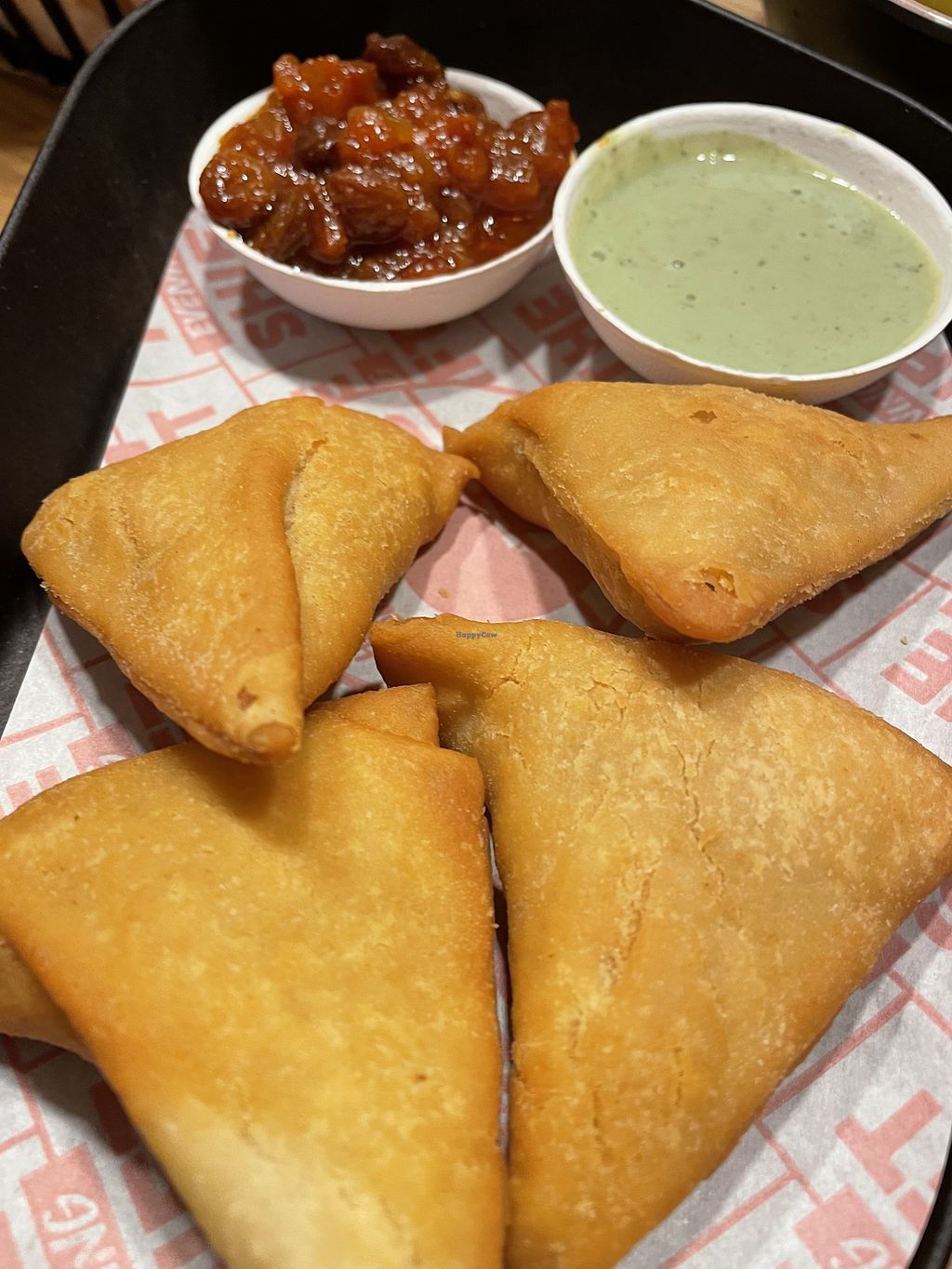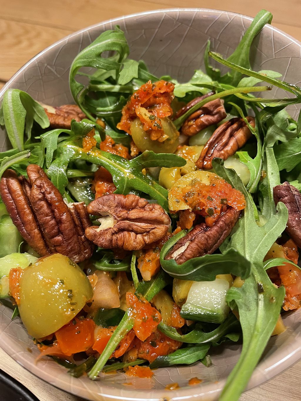 Met zijn drieën gegeten vanavond. We kozen voor 3 hoofdgerechten (loaded fries, Thai bowl en Thai curry met mango), 3 x fingerfood (dumplings, samosas en mini loempia’s) en deelden alles met elkaar (shared dining). We sloten af met 3 desserts waar we hetzelfde mee deden. Heerlijk gegeten.