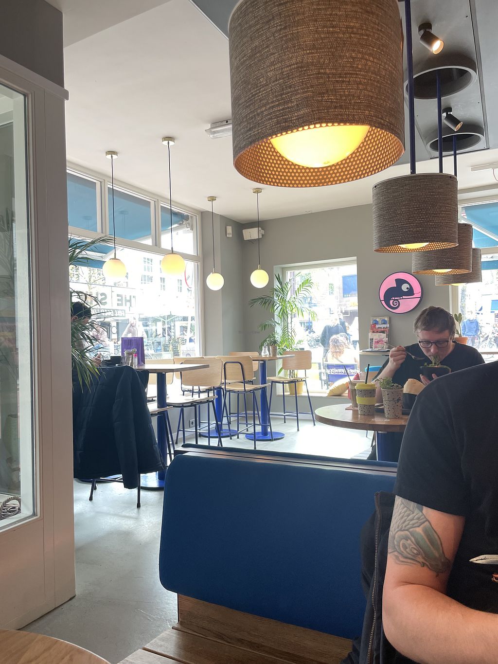 Hip atmosphere and 100% vegan amazing food! Had the Dutch flatbread and hot chocolate with whipped cream. Super delicious, would definitely recommend! The vegan whipped cream was the best I ever had😍