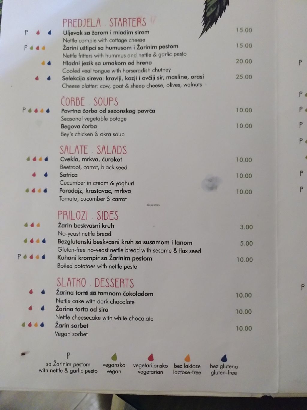 This was my husband's and my favorite place in Sarajevo. I loved that the theme of the place was centered around one plant and the different ways that the plant was used to highlight each dish. The nettle bread in particular was really good! We shared a few dishes, including a few of the salads, which were amazing! We even had the dessert (we are not dessert people typically) and were so impressed! Everything is marked on the menu, which is nice. Please try to nettle pesto and nettle bread!