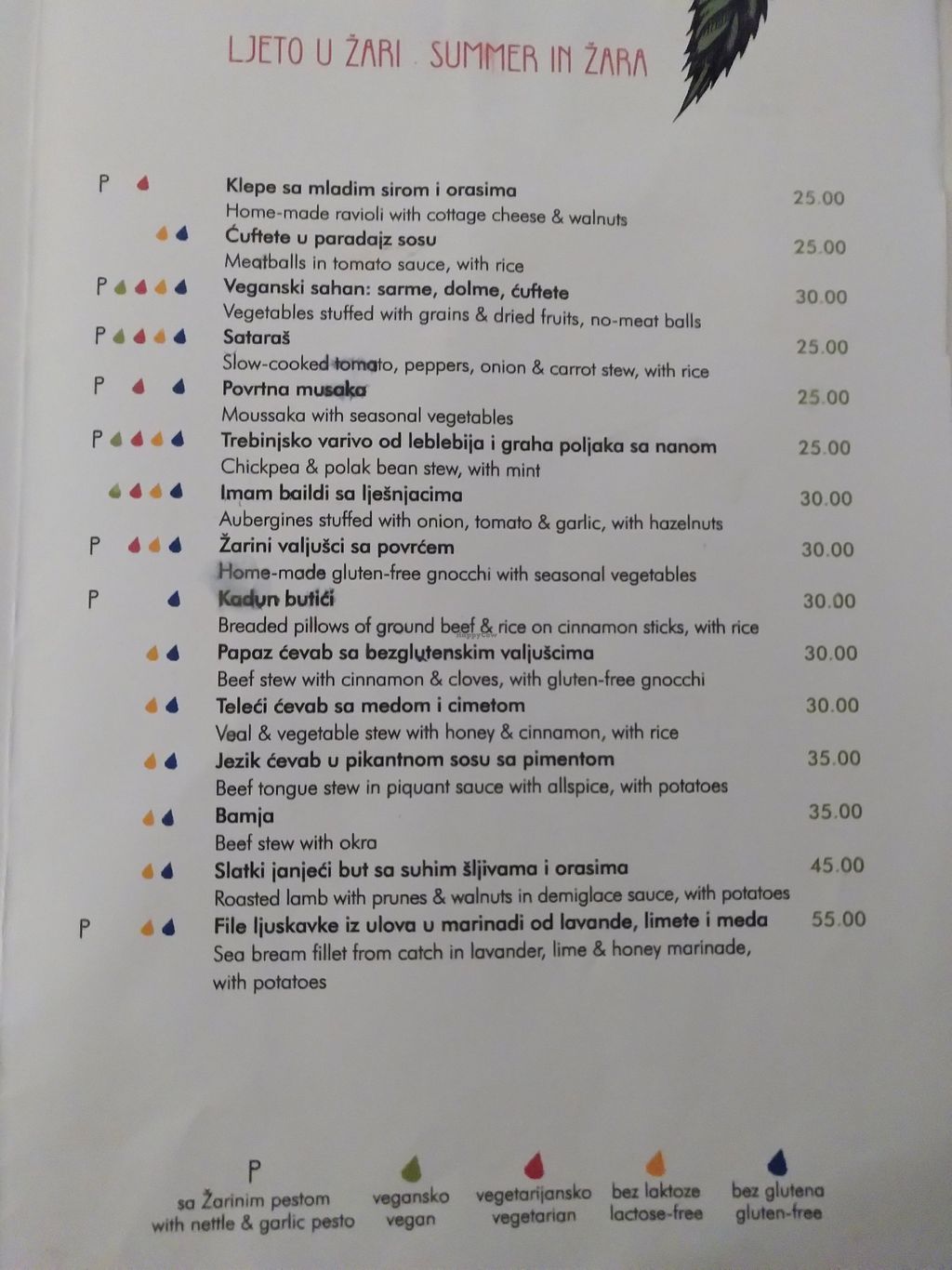 Serves meat, vegan options available. Restaurant serving Bosnian cuisine. Offers a variety of clearly marked vegan choices such as nettle fritters with hummus & nettle garlic pesto, seasonal vegetable potage, kidney bean stew with seasonal root vegetables, salads, vegan sahan with sarma, dolma & plant-based meatballs and sorbet. Relocated from Dženetića čikma bb. Open Mon-Thu 10:00am-6:00pm, Fri-Sat 2:00pm-10:30pm.