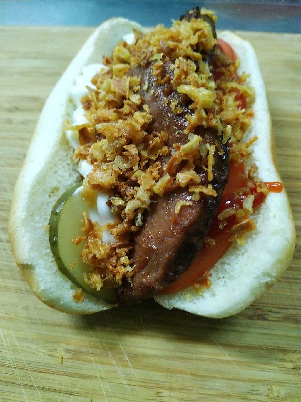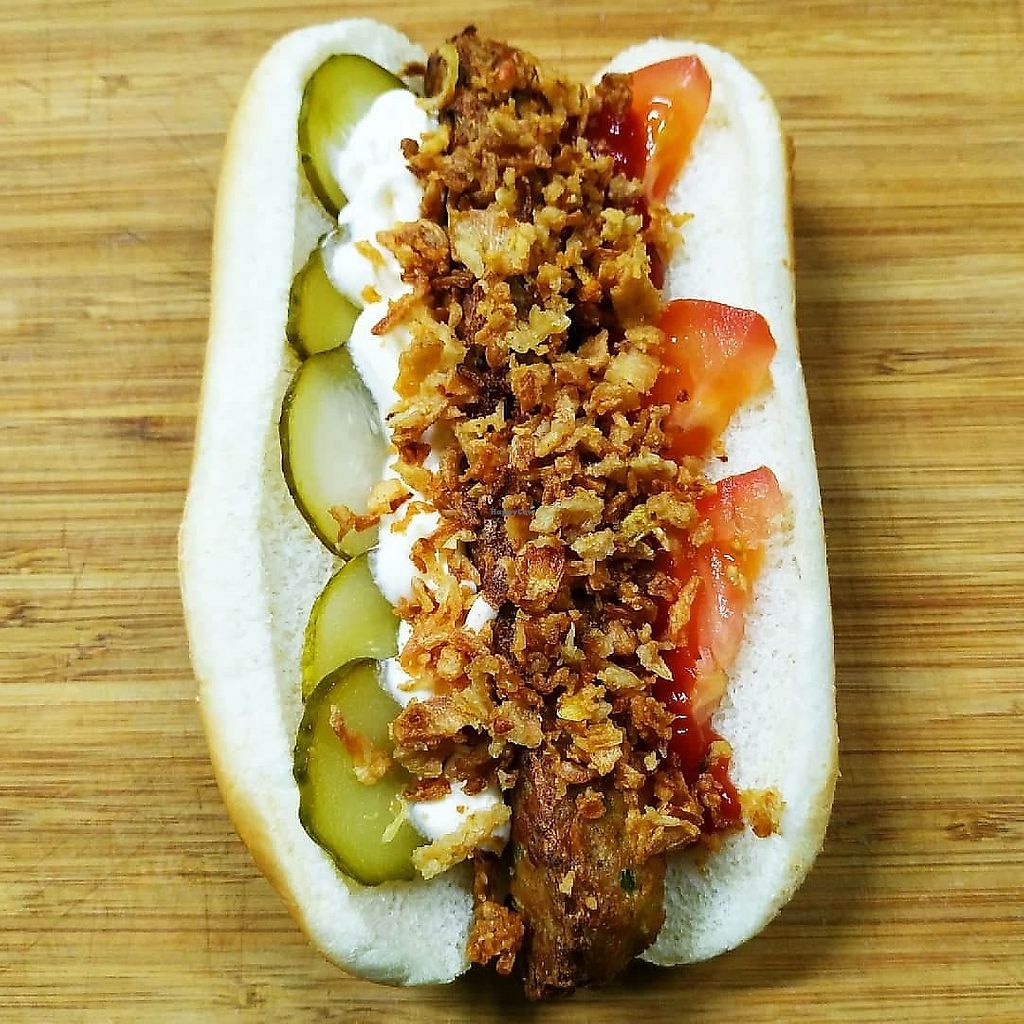 New hot dog with juicy spicy vegan kebab. Новый хот дог с сочным пикан…