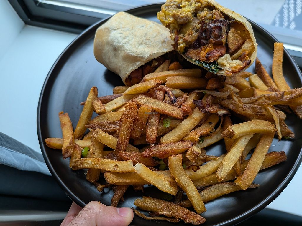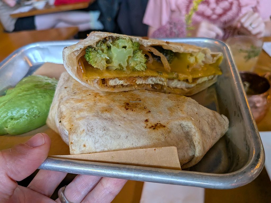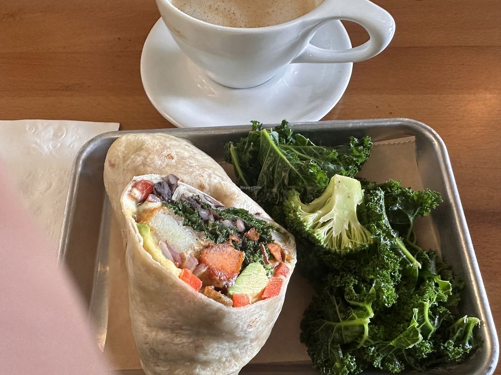 Johnny Utah Wrap, a Side of Kale & Broccoli, & Oat Milk Lattee