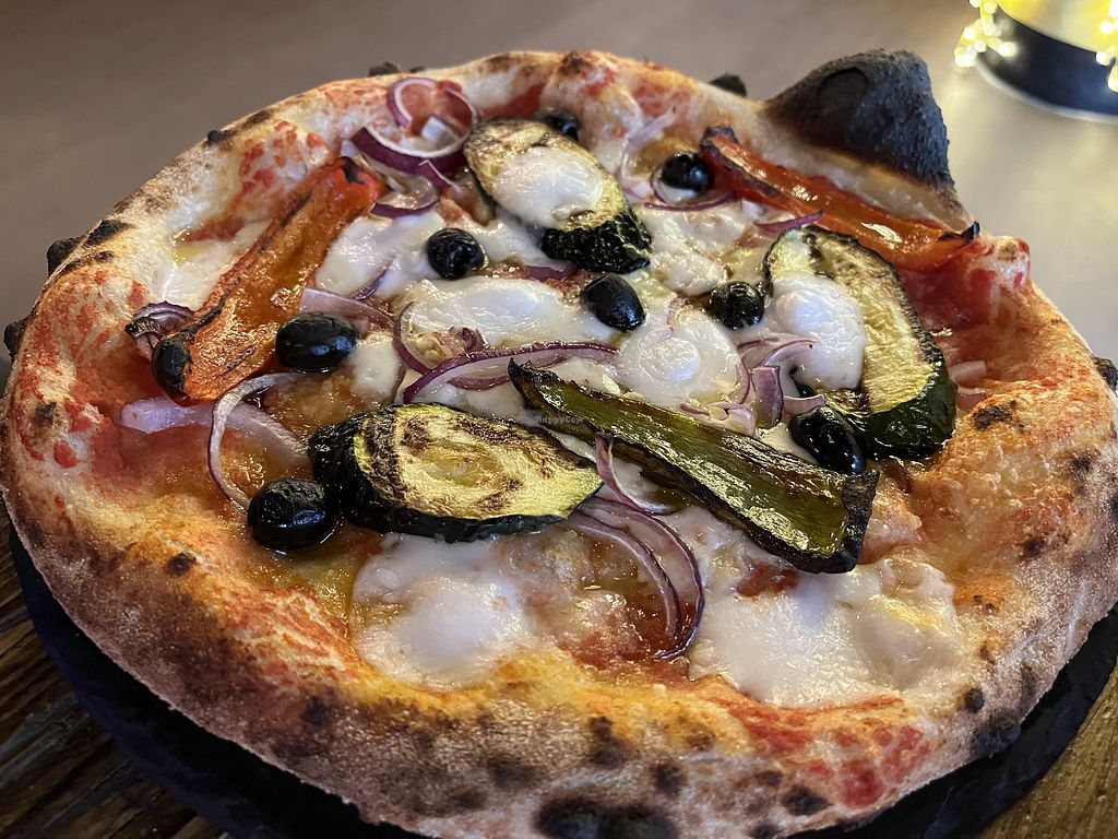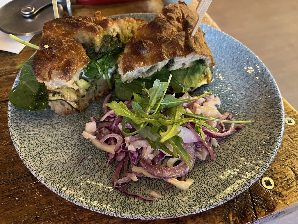 Pesto, courgette, spinach and mozzarella focaccia sandwich