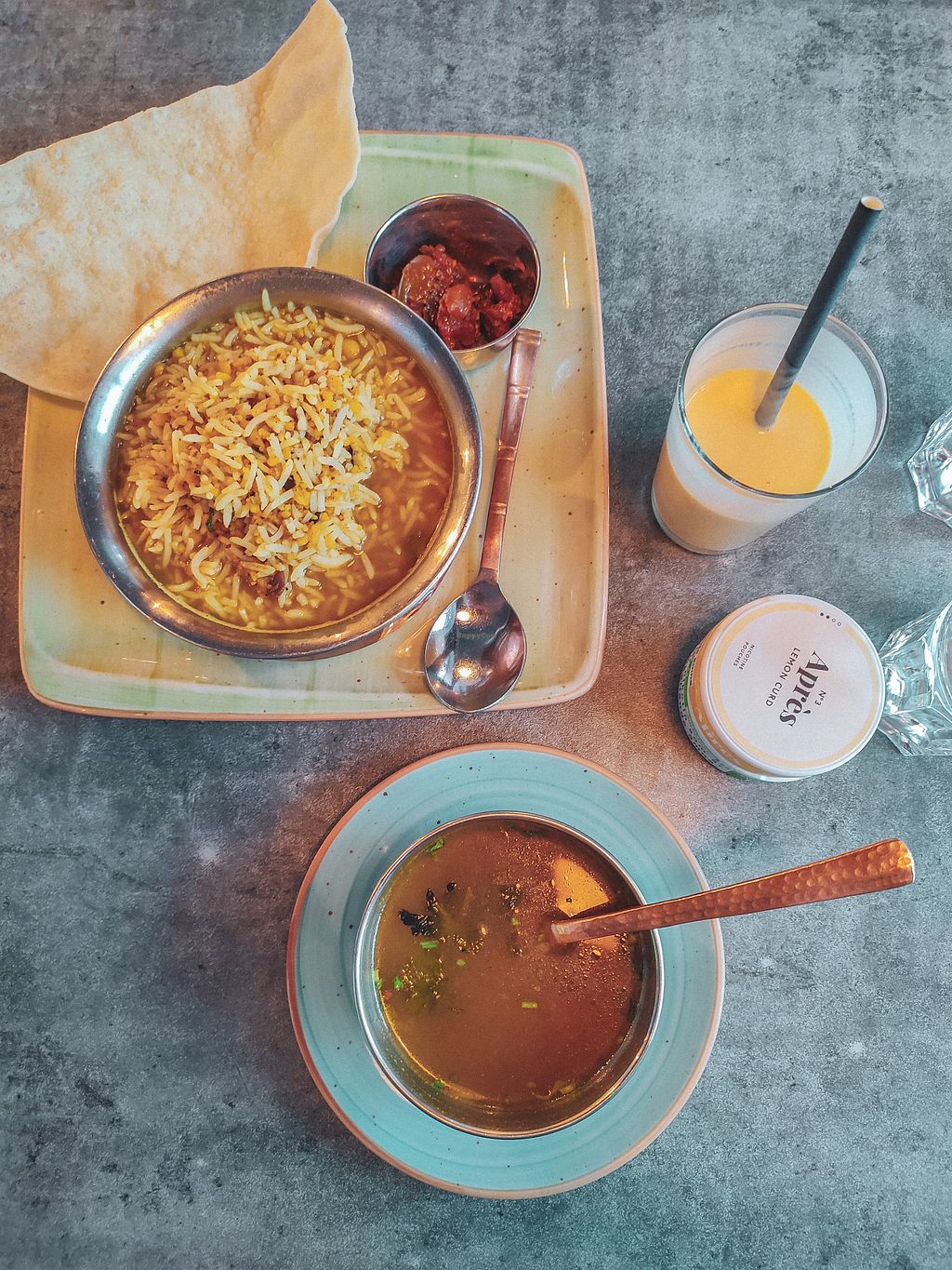 Samosas and Sambar soup. Small portions, and with a small spoon?