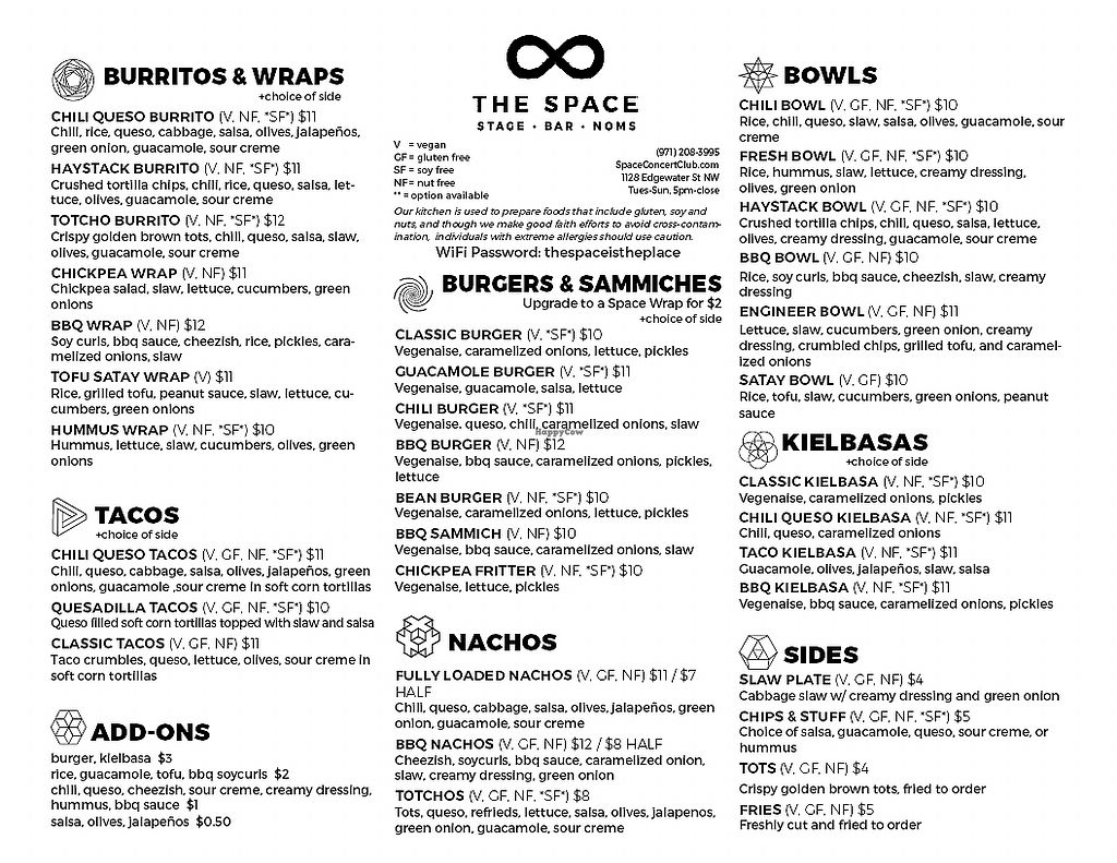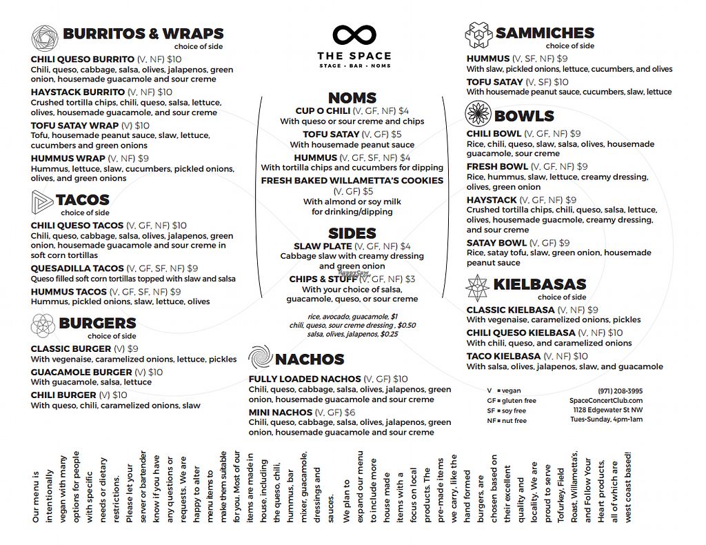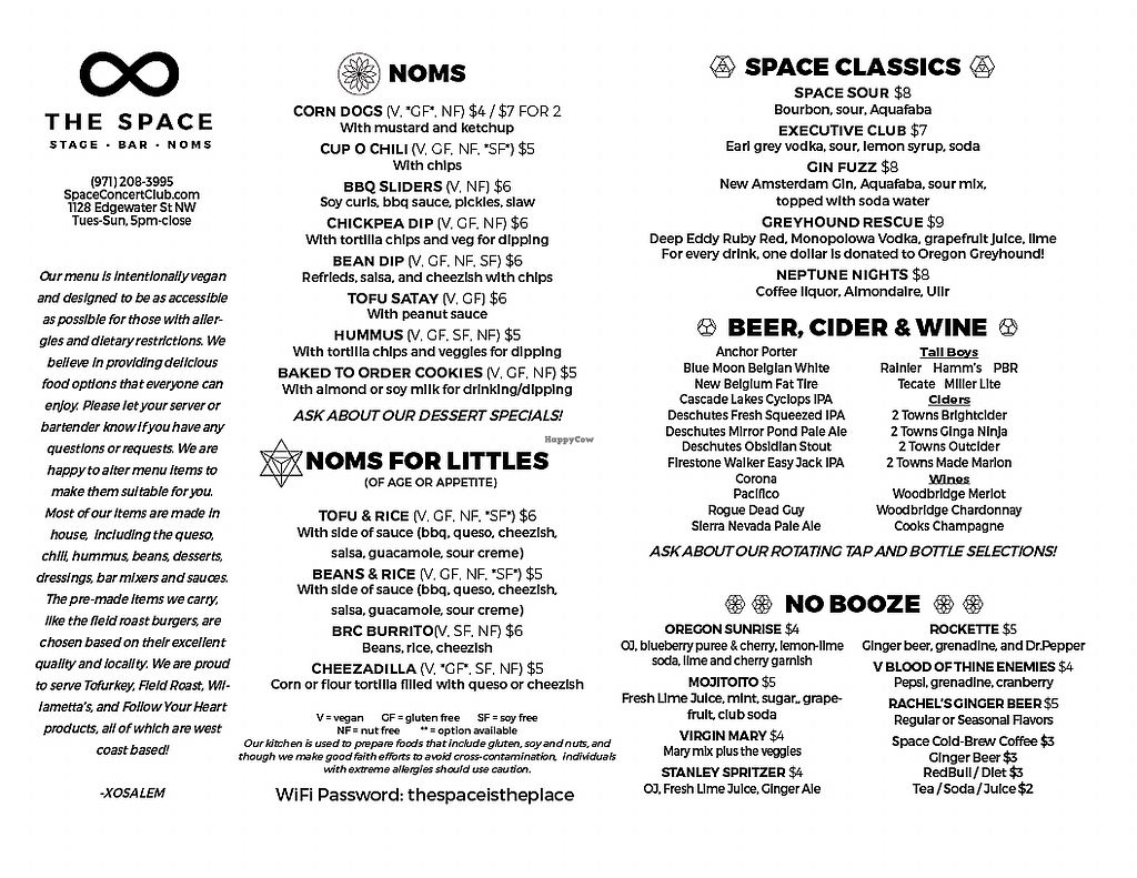 I recently moved from Oregon to Washington. I regret no longer being near The Space. I went to a show there recently and it was a spectacular set up with live music in a welcoming environment that acts like a house show with a full bar combined with an outdoor patio area featuring open sky, trees and a resident opossum(s). The delicious food comes from the only vegan establishment for a 30-mile radius and it's well worth the trek! It tastes just like home cooking. Omnivores approve of the eats when checking out a show or being on-tour. I highly recommend The Space whenever the opportunity to check out a show or dine presents itself...