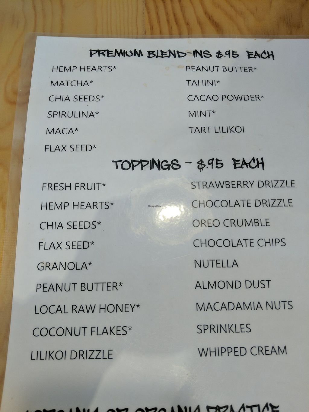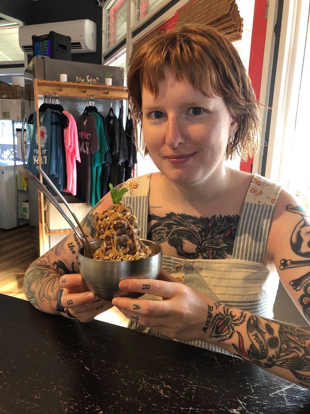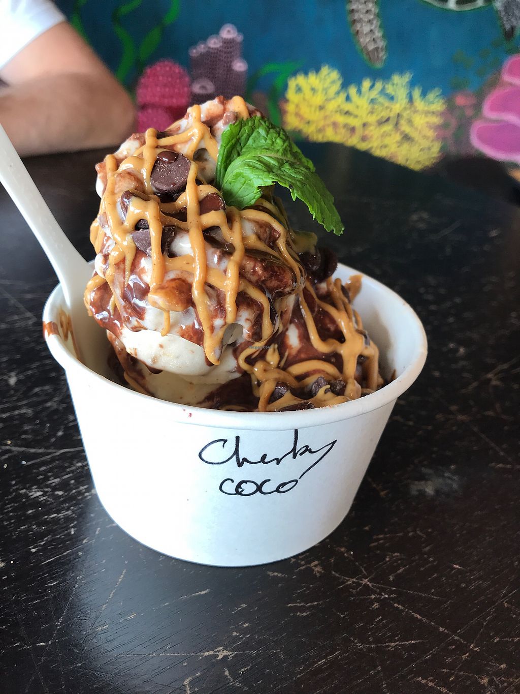 Vegan coconut cream or apple banana sorbet base then mixed with all kinds of toppings in a machine and out fro yo style. I did a coconut base with Oreos and hemp hearts. Big delicious rich ice cream. A little expensive but that's island life.