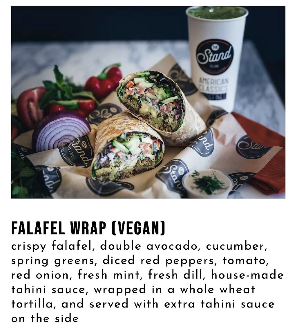 Serves meat, vegan options available. Offers labeled vegan items such as falafel wrap, veggie bliss burger (request no pepperjack, crispy onion strings, sweet chili aioli, or butter on bun), stand fries, sweet potato fries, fire fries, stand chips, chips and guacamole, and side salad. Open Mon-Fri 11:00am-9:00pm, Sat-Sun 11:00am-10:00pm.