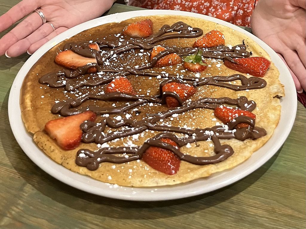 most pancakes can be made vegan and/or gluten free, which is incredible! keep in mind their pancake batter is sugar free, so don’t expect something super sweet unless you order it with maple syrup! it was served to me as one large crepe-like pancake. tasted incredible. i got the strawberry/banana/nutella, but veganized (batter) and with their homemade chocolate sauce (dark chocolate and vegan) instead of nutella!!! really cute inside, like a quirky strawberry themed cabin. my boyfriend got a non-vegan pancake and said it was delicious too, so they satisfy (almost) everyone’s taste! highly recommend😄