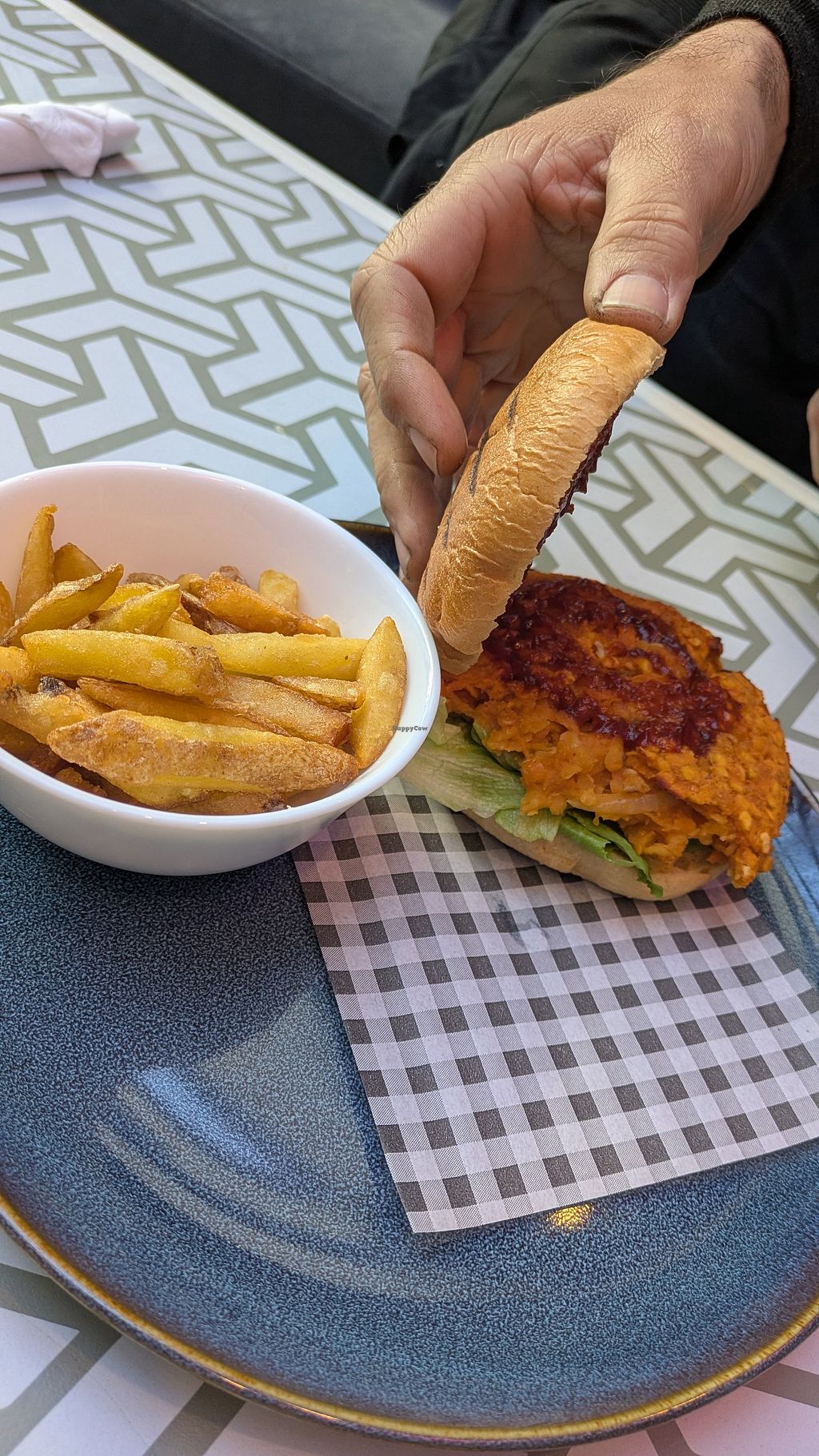 Ambience was great, speedy service. There was a whole section for the vegan food - with Beyond burgers, curries, and pasta. It came quickly and I thoroughly enjoyed my burger. It was served with vegan sauce and fries, it felt like the burger was not missing anything; juicy and tasty.