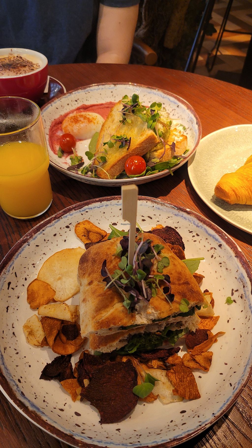 A cute place with a fun interior, the truffle sandwich was nice, the pumpkin soup was mid. It’s not vegetarian though, they serve fish at least on their menu.