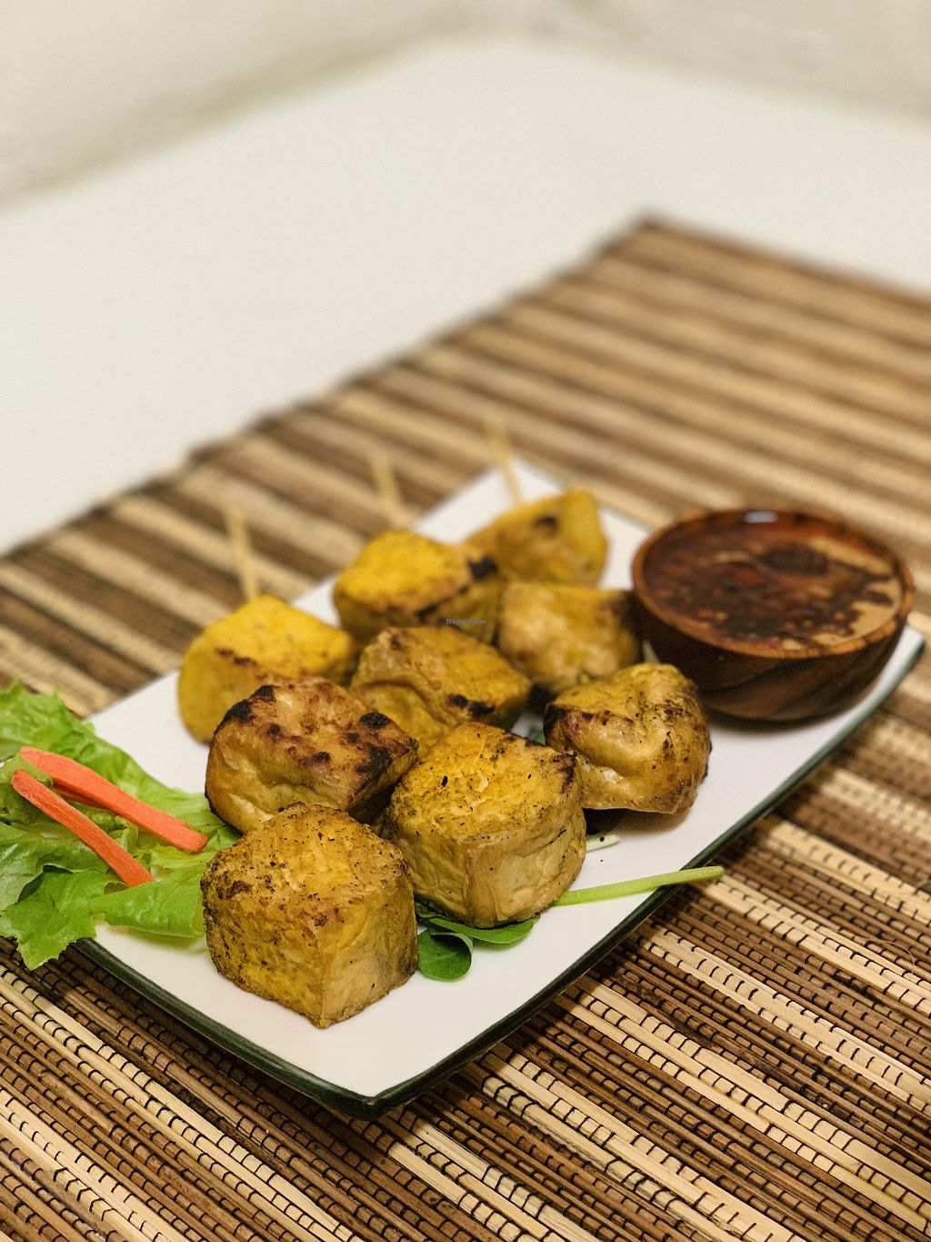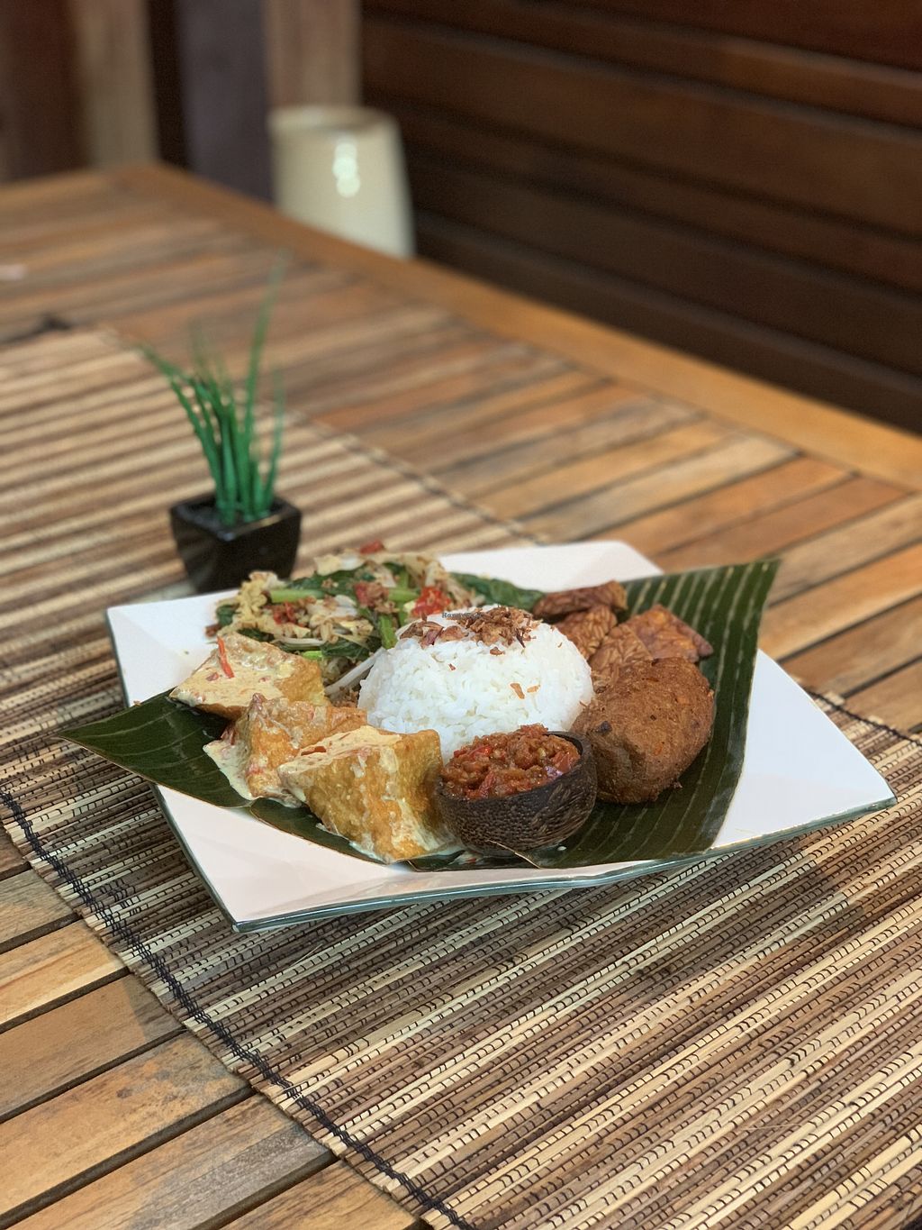Nasi Campur Vegan Spicy coconut tofu, potato kroket, tempe & coconut …