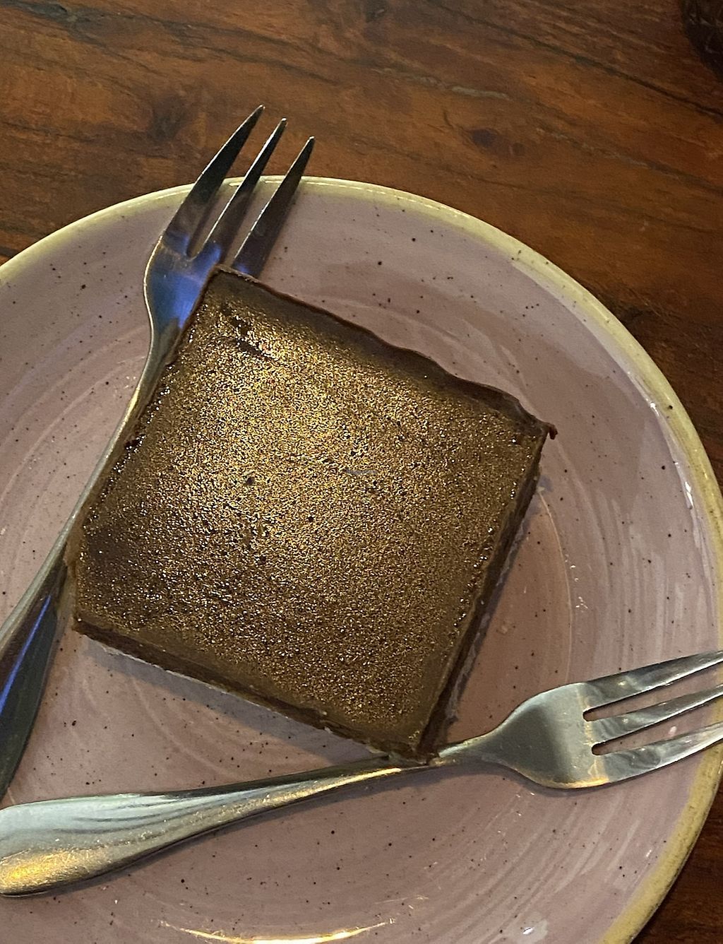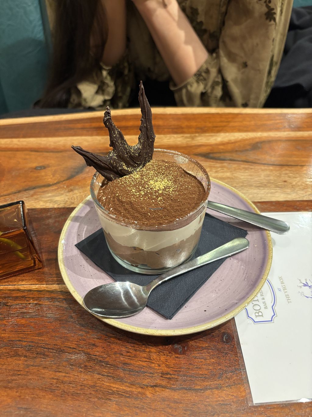 I got a full English breakfast, oat milk latte, and a tiramisu. I also tried some of Purp's salted caramel cake.