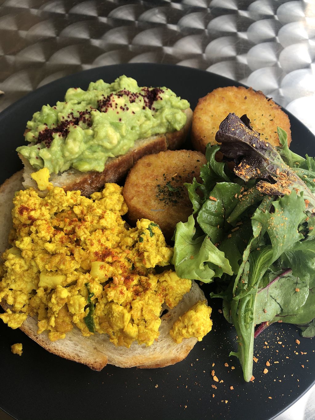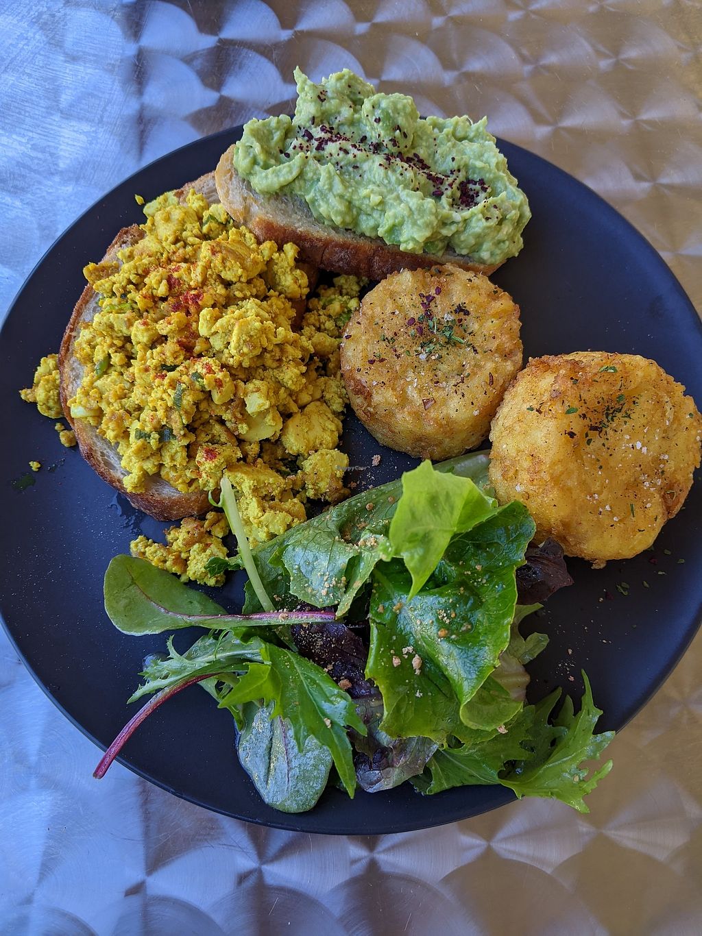 Scrambled tofu, smashed avo and potato