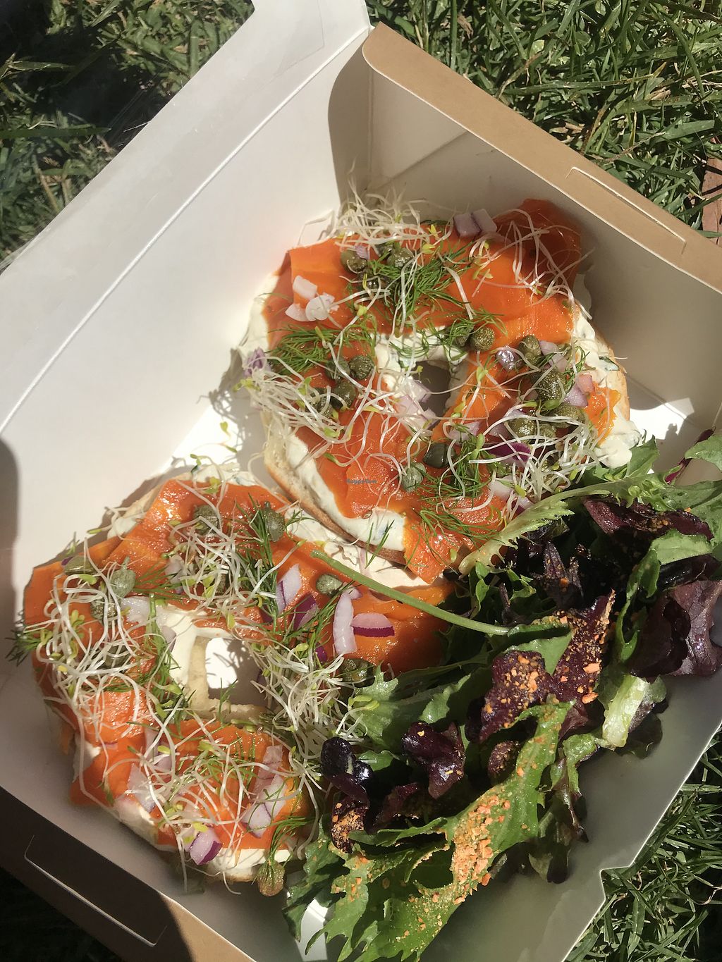 Salmon 🥕 bagel with cashew cream cheese and sprouts and capers — SO YU…