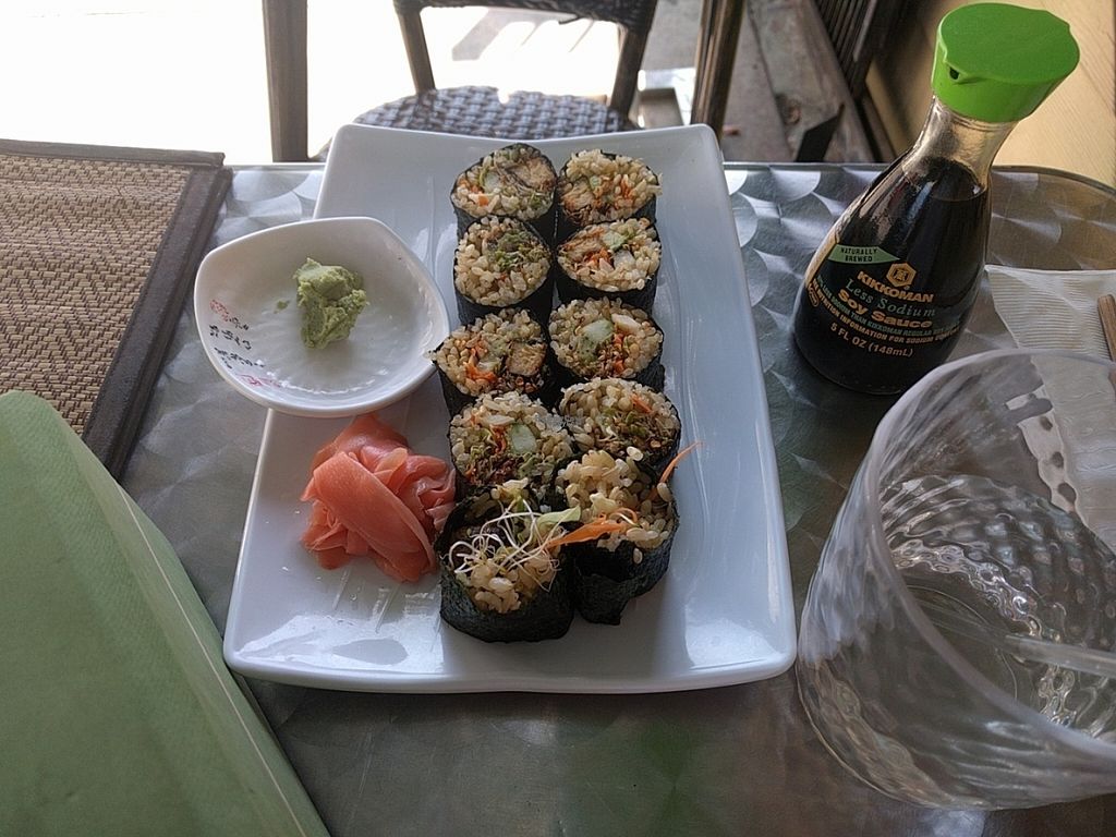 I saw a lot of people getting take out while I was dining here today. No one I was with was that happy with their food. Not saying that if you live in the area there couldn't be something good on the menu, but this isn't a destination. Go elsewhere my vegan friends. I was charmed by the scrambled tofu sushi. Too big to eat in one bit and too messy to eat otherwise, but if you're with a group of people who are entertained by strange food definitely get them. Please don't think of this as a bad review, the menu is huge and if you live nearby I'm sure you'll find something. Its inexpensive. Its just not great or good, but its vegan and its food. Its hard to mess up plants, they taste good from the get go... I'd suggest the chef to reformulate and dine at vegan glory a few times. There's no reason they can't be just as good.