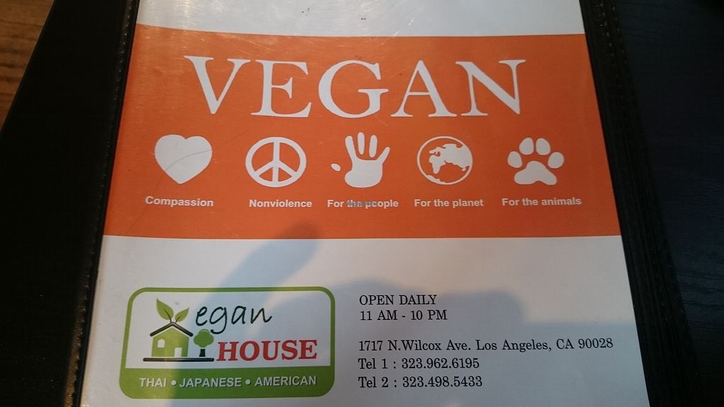 Hollywood vegan restaurant with extensive menu featuring various faux meat Thai food dishes, soups, curries, veggie sushi, pancakes, rice and noodles bowls, shabu shabu hot pot, and more. Small space, simple setup. Has 2 tables outside for seating. Parking on street. Different owners from Vegan House on Sunset Blvd in Silvelake. Confirmed closed May 2017.