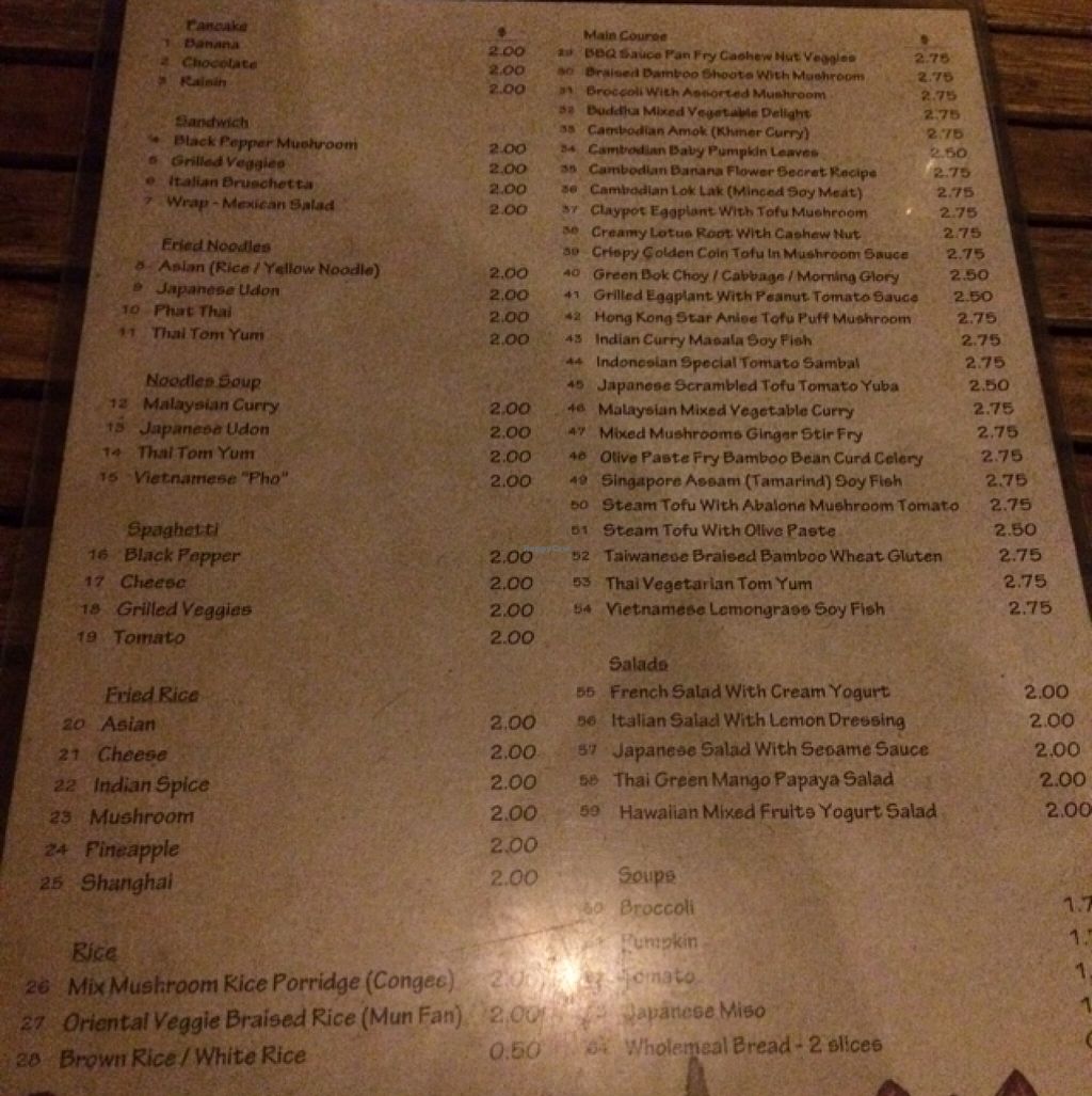 I've just had dinner here. The place is very nice: peaceful, quiet, protected by the noisy daily routine of Phnom Penh. Food is good, but not great. I had a few dishes and they tasted all the same (good, but the same). Summer rolls were served with a hot chili sauce (I did not like it). In general, a good dinner: relaxing and good vegan food (two things that one should not take for granted in Cambodia). The only negative thing is the staff: service is slow and inefficient. I hope they will improve it. Price is higher than in the previous reviews.