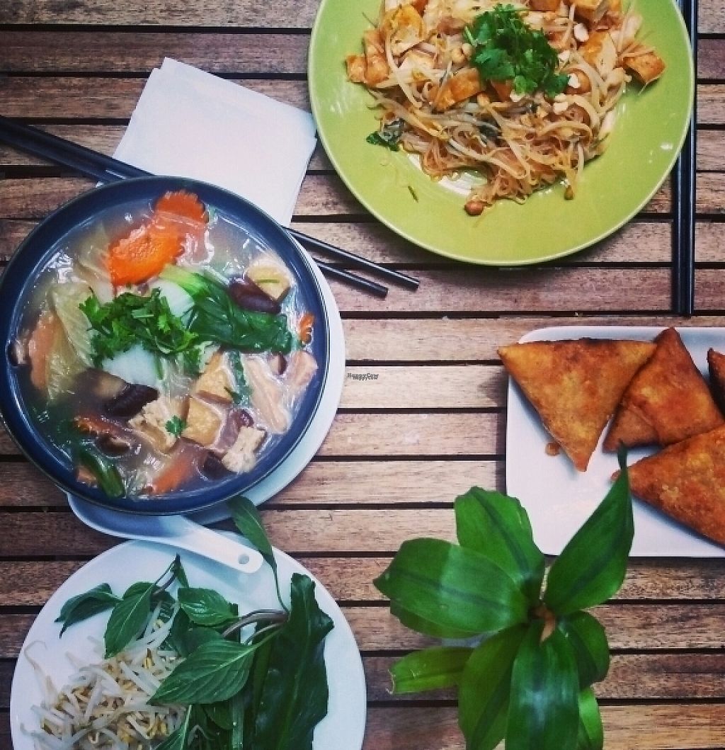 I had a big bowl of the mushroom rice porridge for 2usd and took away samosas (4) for 2usd. Both were nourishing and tasty. The staff was sweet though it was hard to get their attention at times. It seems I arrived after the lunch rush that was filled with locals, monks and a table of foreigners. There is a room of free informative things in the back so this place has my vote for sharing and spreading love. It was clean and a nice place to relax or bring people with wood style tables and chairs. If you get samosas I recommend asking for some chili sauce with it. No AC