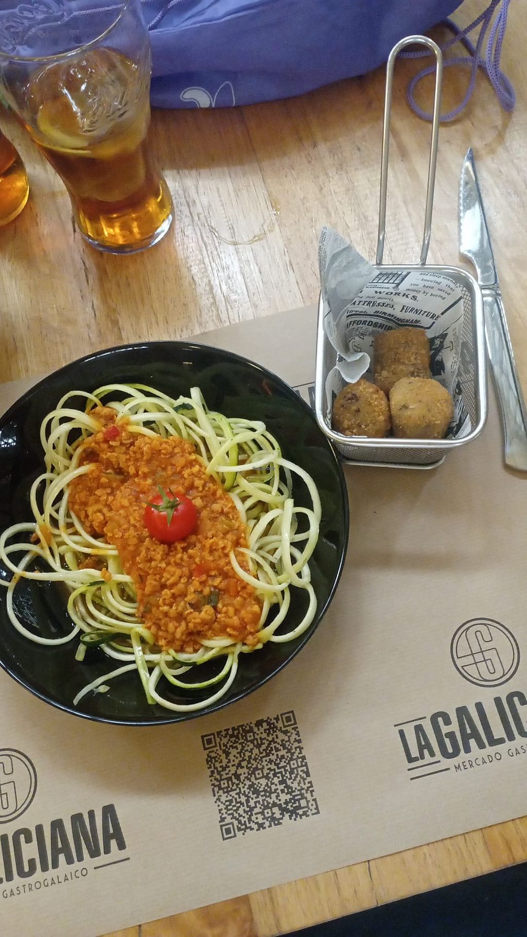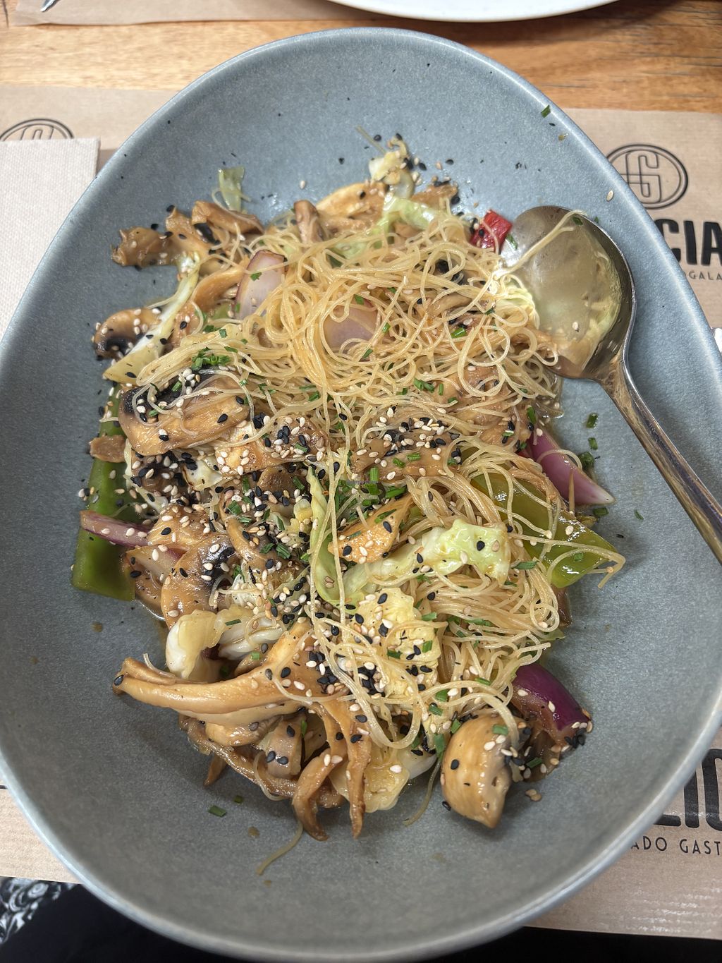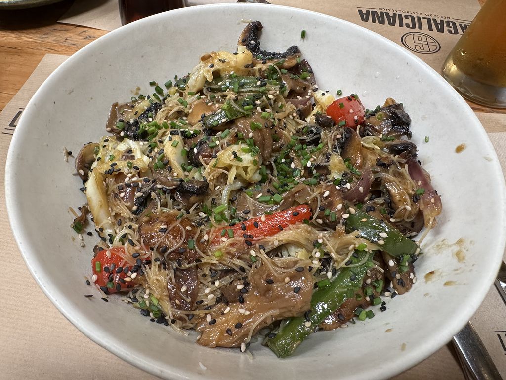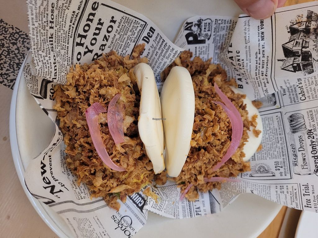 Bao de Heura con verduras e cebola. Hummus con verduras e nachos (xa a…
