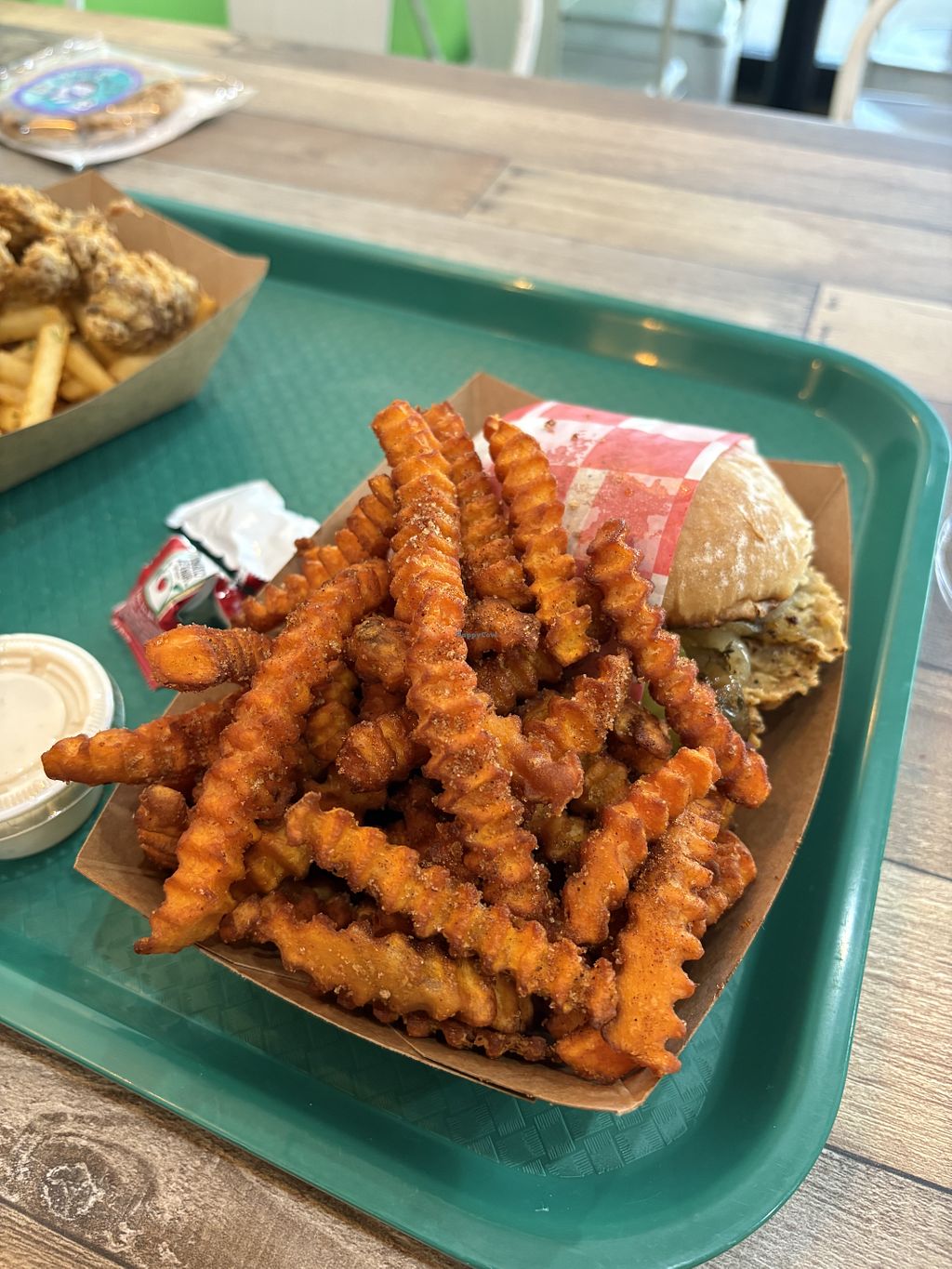 I like the new location and the seating that is available. I tried the Crabless Cake Sammy and it was good. The fries were very crispy and fresh. The sticky orange basket was my favorite.