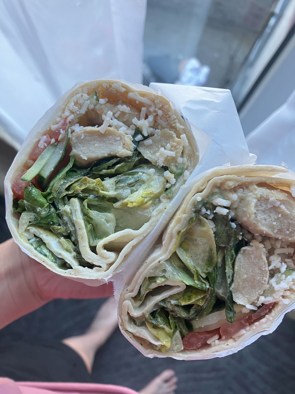 We got a couple options for takeaway: Caesar wrap and Caesar salad, as well as Greek wrap and the caprese deli.