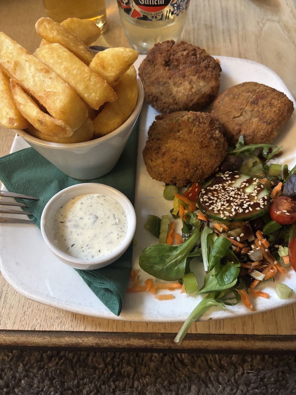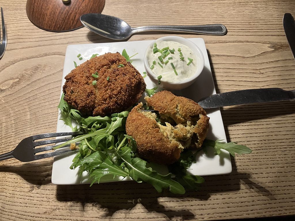 The pub is historic and beautiful, roaring open fire in the winter, cosy little rooms, very nice clean toilets, loads of parking, good service - what is not to like?! The food is, most importantly, also excellent, all veggie but at least half vegan or vegan adaptable. We could only manage starters and mains as the servings were generous. Nice choice, traditional things like fish and chips, and lots of more foreign origin based meals like Thai yellow curry, enchiladas, Lebanese flat bread. Something for everyone. If the little shop attached is open you are in for a treat, plus there are take away homemade meals available to buy