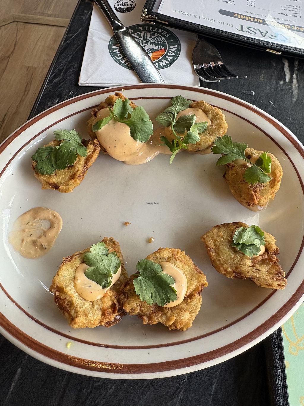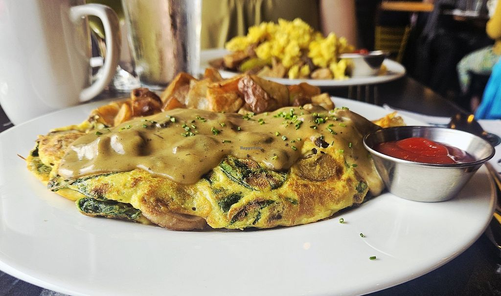 Great spot for all-day breakfast and Sunday brunch. We had a hash with faux eggs and steak tips plus a mushroom gravy omelet with vegan cream cheese, both served with crispy deep-fried hashbrowns. The strawberry matcha iced latte was a fun additional treat. Portions were huge, service was quick despite the busy crowd, and the steak tips were shockingly realistic in texture and flavor, having gluten-free faux meat was a rare bonus. If hearty American-style breakfasts are your thing, this place nails it. No surprise they’ve won Best of the PNW in the Seattle Times two years running.
