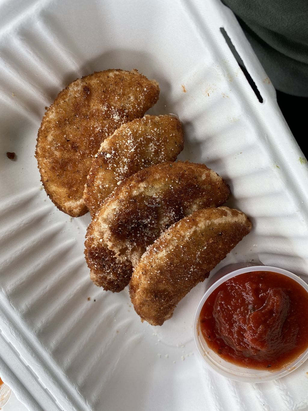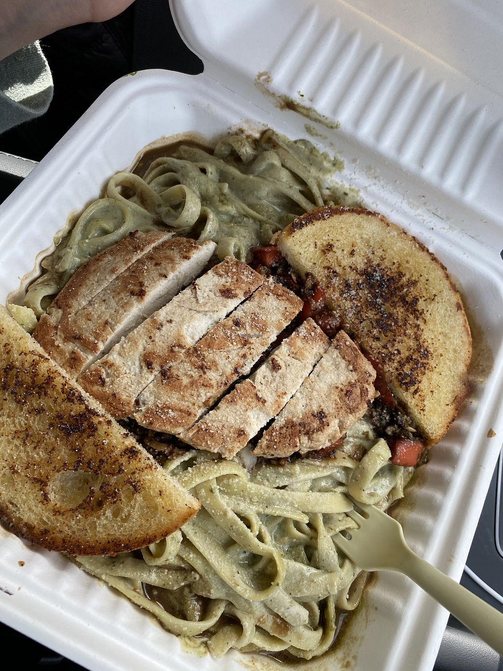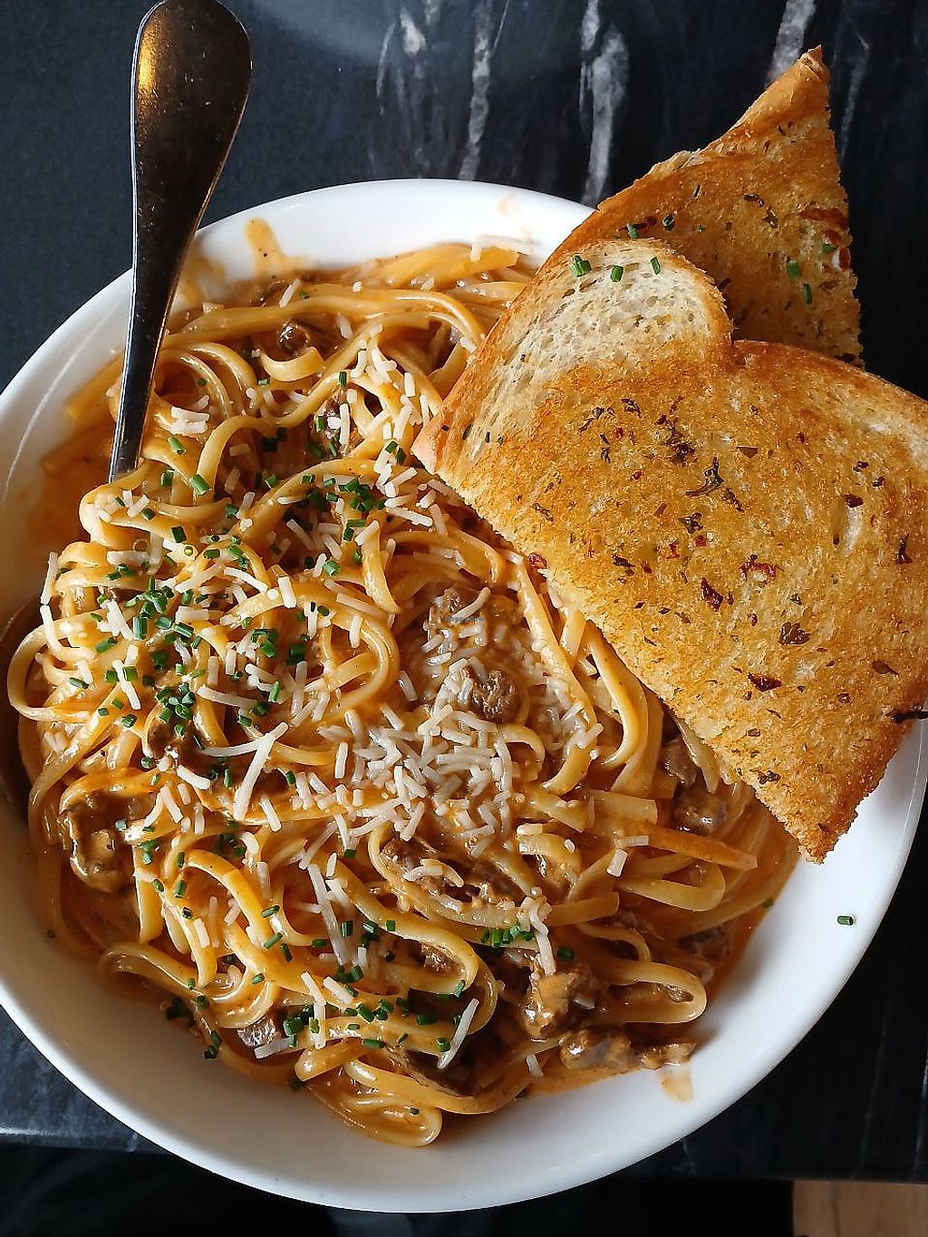 The food here was just okay overall — nothing too memorable, though the pasta dish with the bread was a nice touch. Maybe the experience would’ve been better if we had eaten everything fresh instead of takeout.