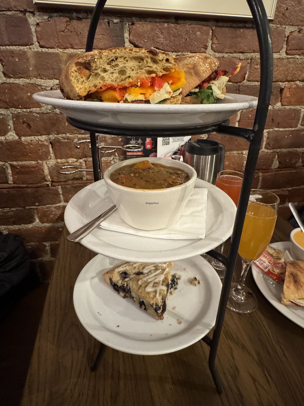 I went for the tea set or something which came in a tower this which was cool. I got a herbal tea, a big vegan Asian salad, a cup of their sweet potato black bean quinoa chili, vegan garden sandwich, blueberry lemon scone.