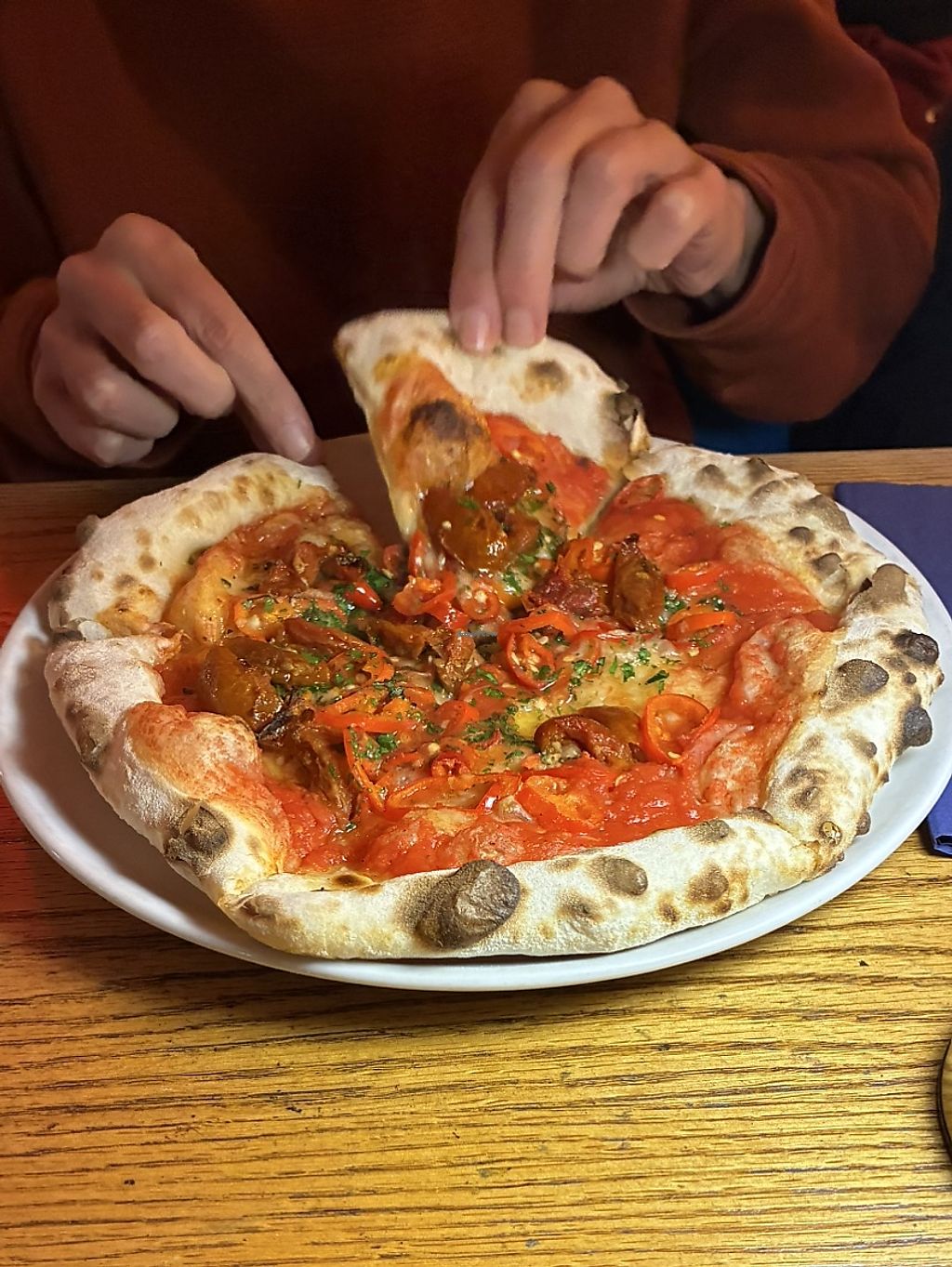 Read moreWe have been going here for a few years now. We used to order pizza without cheese but one day they realised, and said, “we have vegan cheese” and brought it to the table to show us! They now have some special vegan options on the menu (menu constantly changes). Pizza bases lovely and nice to see the oven / flames. Busy place, does lots of takeaway too.