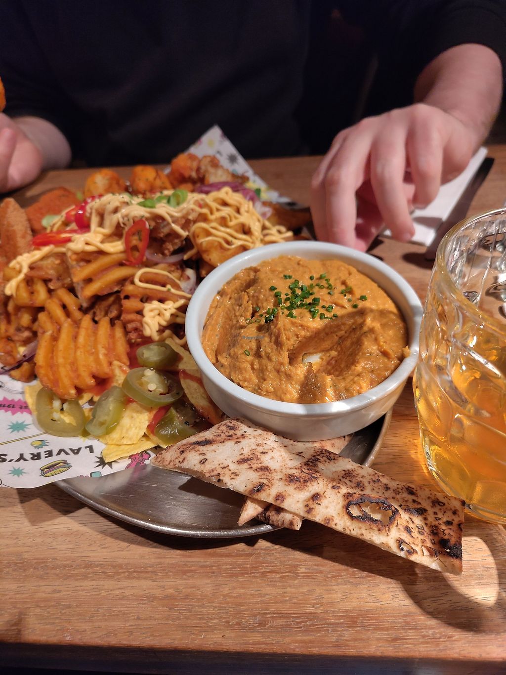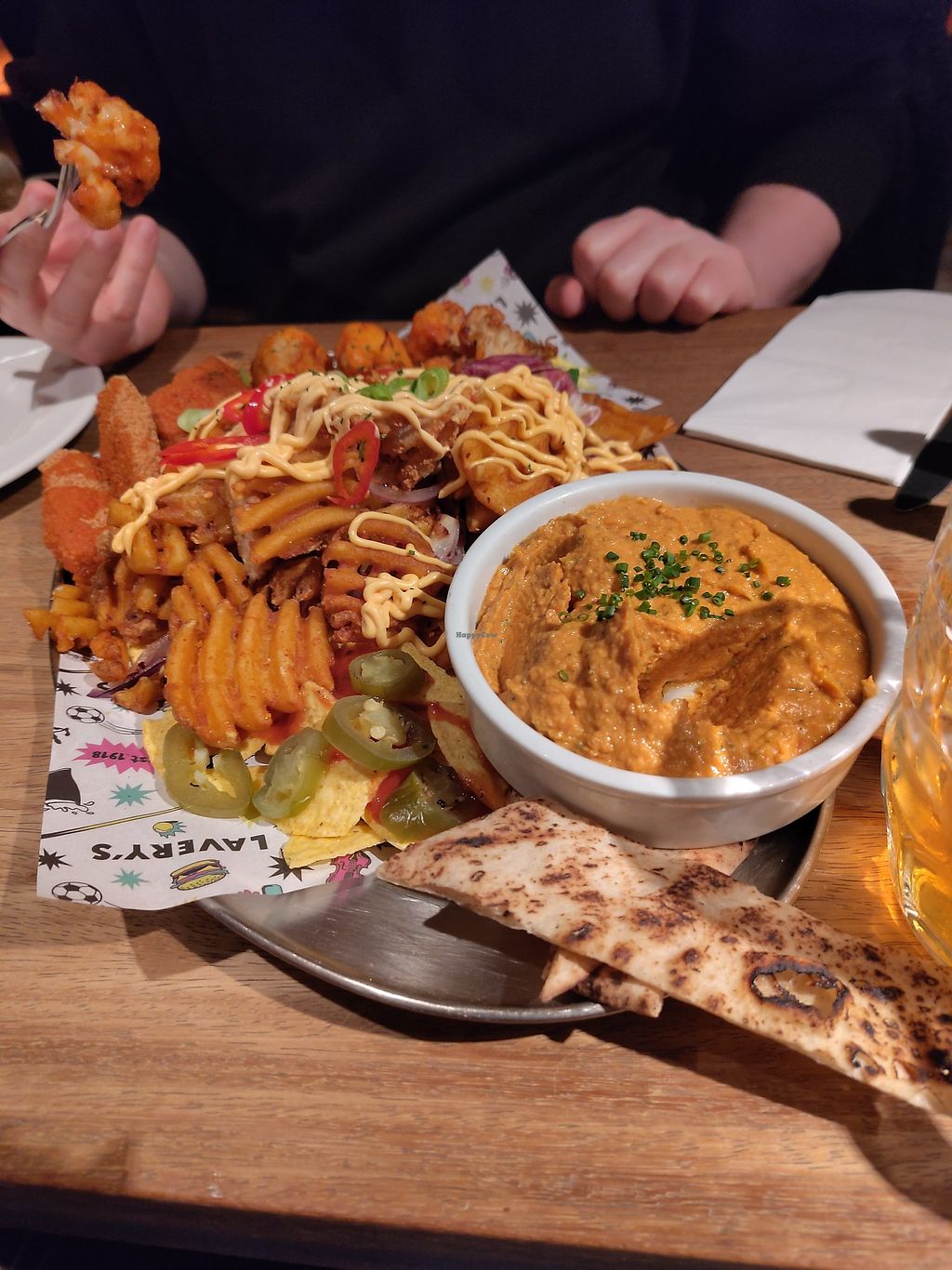 Comprises bowl of pepper humus, nachos, buffalo cauliflower and vegan …