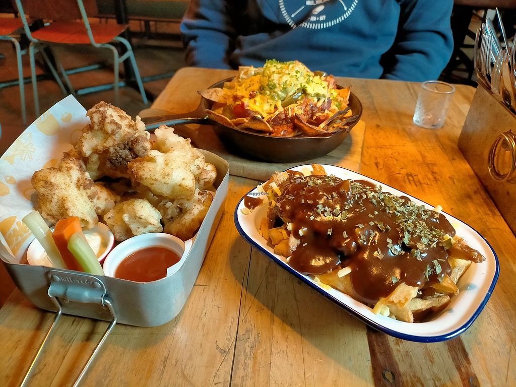 Vegan options such as vegan poutine and vegan nachos. Also a burger and cauliflower bites that can be made vegan.