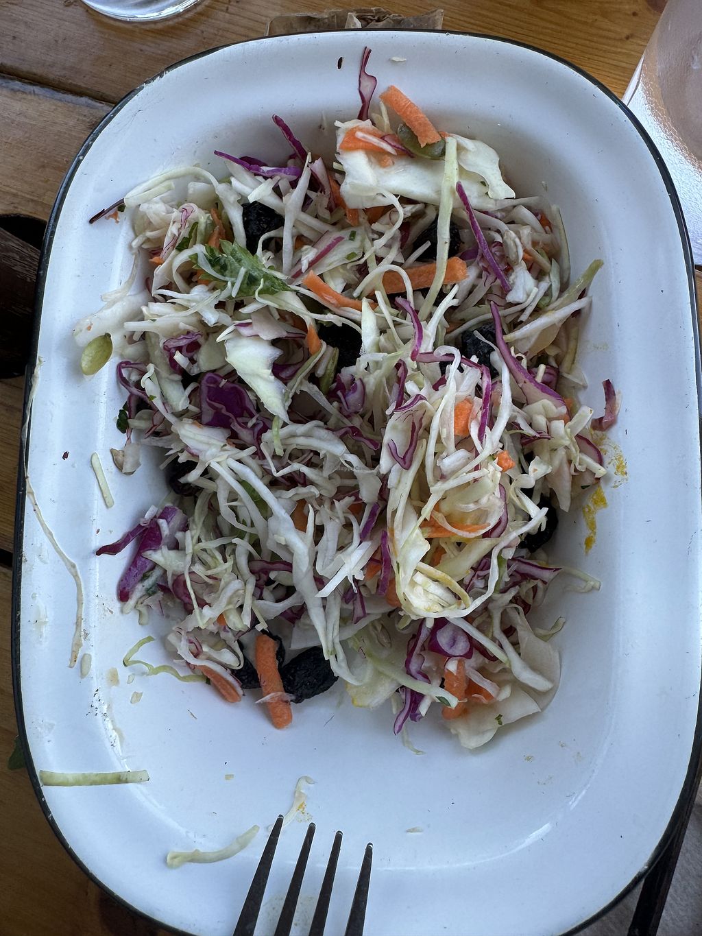 - vegan Power slaw - pretty good 5.5/10, kinda bland, not creamy. Raisins were dry and just sprinkled on top